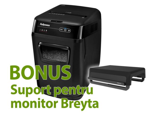 Cumpara un distrugator Fellowes Automax 150C sau 200C si primesti BONUS un suport pentru monitor Fellowes Breyta, negru.