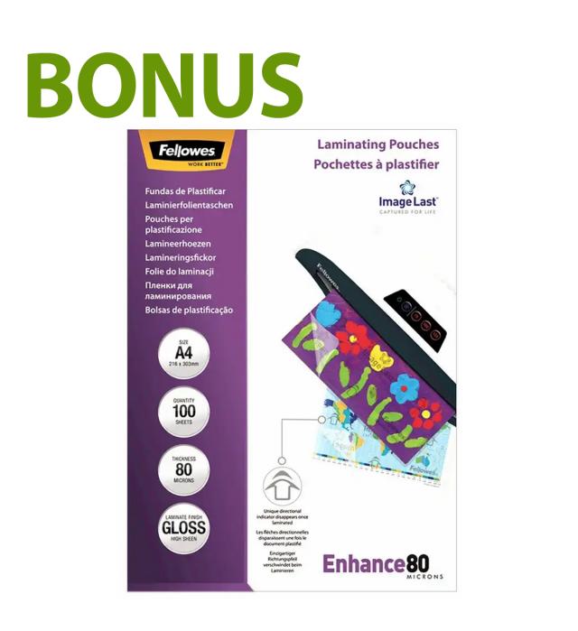 La toate laminatoarele selectate ai BONUS un set de folii laminare 80 microni Fellowes A4, (25 buc/set)