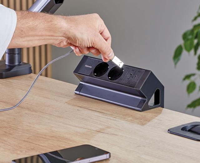 La doua birouri achizitionate primesti CADOU o priza de birou Fellowes Desk Up