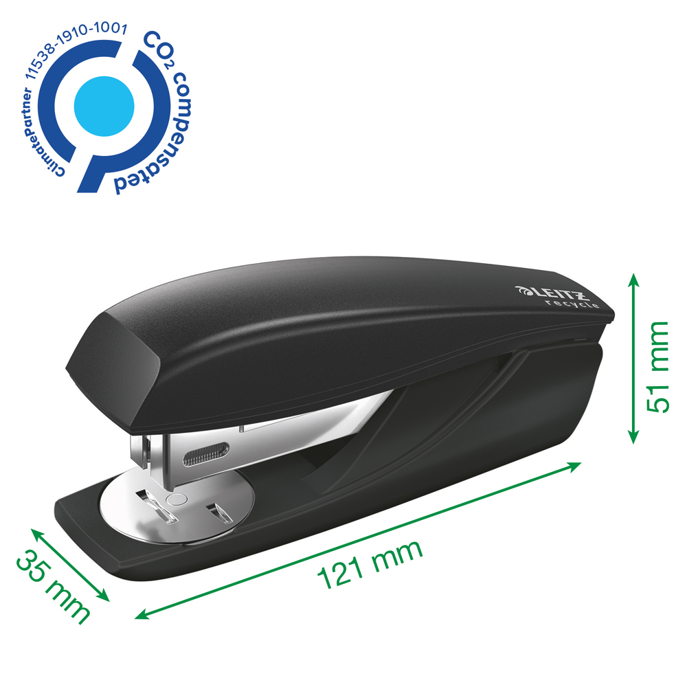 Capsator mic atragator, creat din materiale premium si fabricat din plastic reciclat post-consum, este ideal pentru utilizarea zilnica la birou. Acest produs este neutru climatic prin reducerea si compensarea CO2 si este 100% reciclabil, putand fi complet demontat. Tehnologia patentata Direct Impact si capsele Leitz Power Performance P3 (24/6, 26/6) asigura capsarea perfecta de fiecare data. Acest mic capsator de incredere completeaza perfect alte produse din gama Leitz Recycle si este facut pentru a dura. Papetarie sustenabila si contemporana care va arata grozav acasa si la birou. Cu gama ecologica Recycle de la Leitz imbunatatesti atat mediul biroului tau, cat si mediul inconjurator.