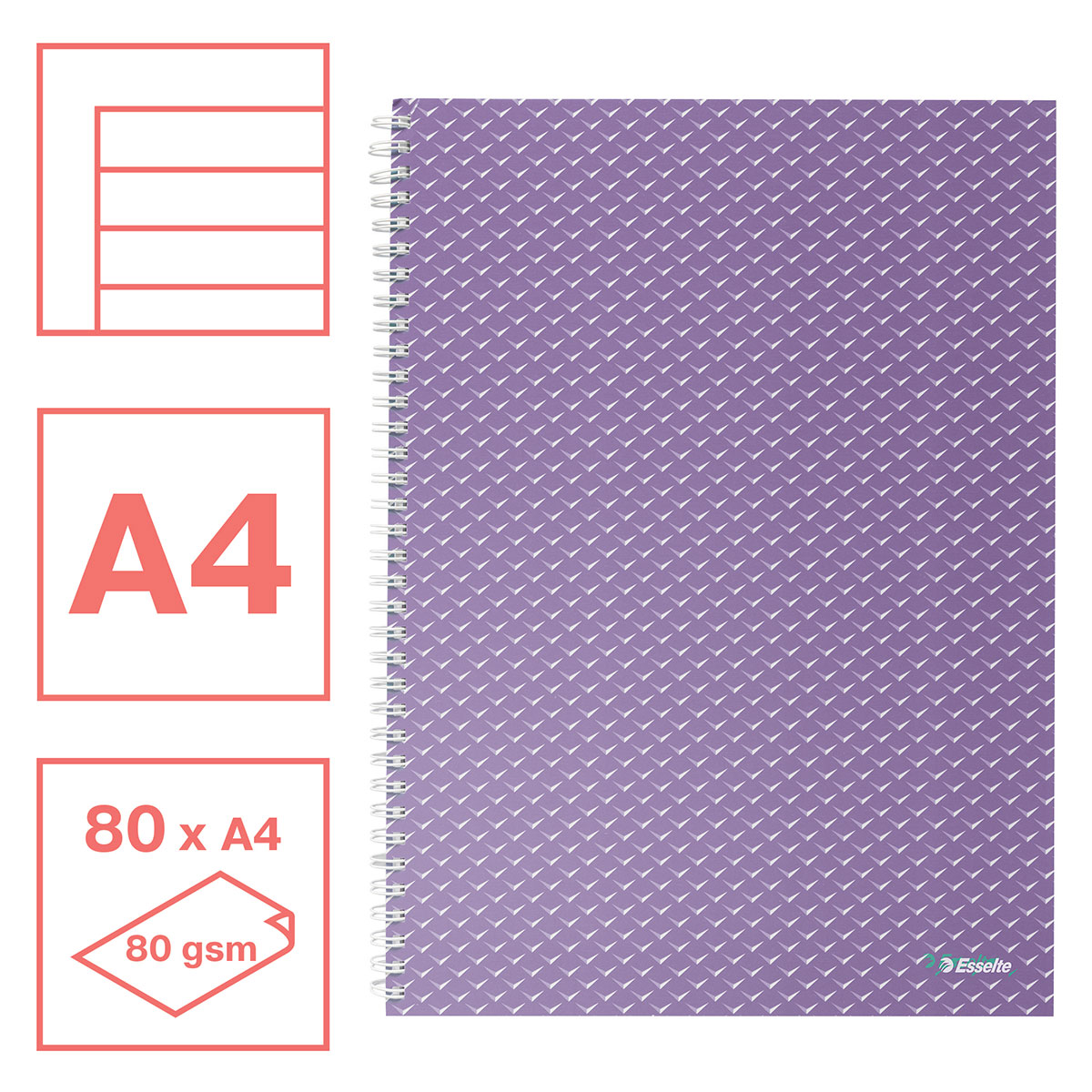 Caietul Esselte Colour'Breeze A4 cu coperta din carton, cu design placut si cu spira, este ideal pentru a lua notite in fiecare zi acasa, la scoala sau la birou. Contine 80 de coli liniate, microperforate si perforate in prealabil, astfel incat sa poata fi scoase si puse intr-un dosar. 160 de pagini cu marja exterioara pentru a marca cele mai importante randuri sau pentru a semnala greselile de text. Poate fi deschis la 360 de grade, ceea ce il face perfect pentru a lua notite in miscare. Disponibil intr-o selectie de culori vibrante, in designul proaspat si modern Colour'Breeze cu relief si finisaj metalic. O briza proaspata in viata ta!