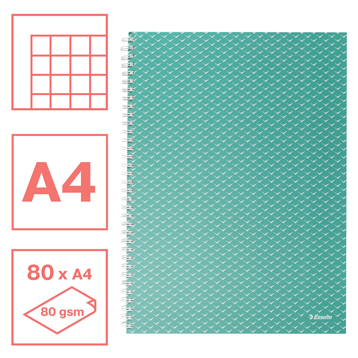 Caietul Esselte Colour'Breeze A4 cu coperta din carton, cu design placut si cu spira, este ideal pentru a lua notite in fiecare zi acasa, la scoala sau la birou. Contine 80 de foi de matematica, microperforate si perforate in prealabil, astfel incat pot fi scoase si puse intr-un dosar. Cu 160 de pagini si margine exterioara pentru a marca cele mai importante randuri sau pentru a semnala greselile de text, acest caiet poate fi deschis la 360 de grade, ceea ce il face perfect pentru a lua notite in miscare. Disponibil intr-o selectie de culori vibrante, in designul proaspat si modern Colour'Breeze cu relief si finisaj metalic. O briza proaspata in viata ta!