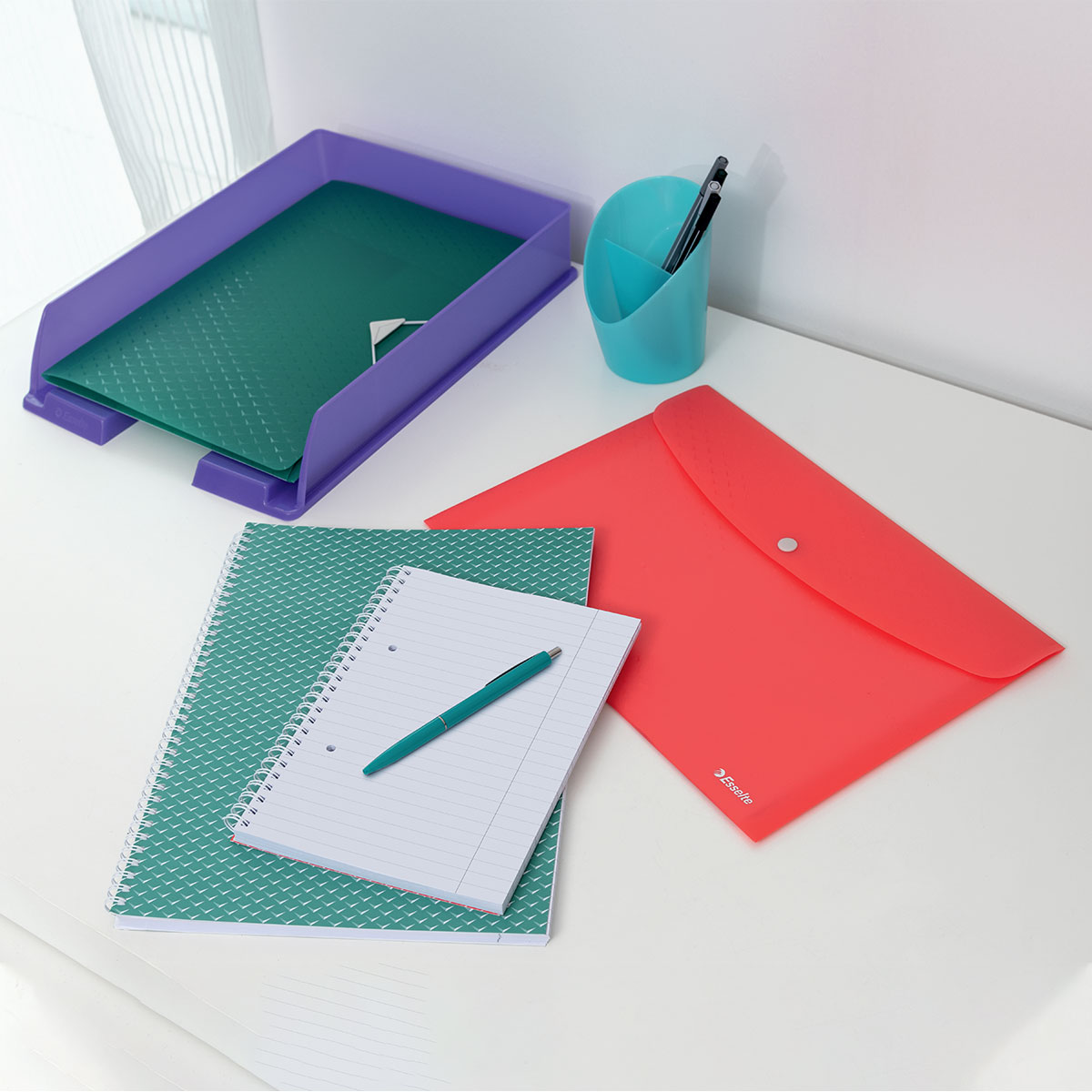 Descoperiti culorile luminoase ale naturii pentru a crea un spatiu de lucru pozitiv cu gama Colour'Breeze de la Esselte. Conceput pentru a va mentine organizat si motivat in timp ce studiati sau la serviciu, finisajul modern si culorile relaxante va vor face sa visati la urmatoarea aventura. Caietul Esselte Colour'Breeze A5 cu coperta de carton, cu design placut, este ideal pentru a lua notite in fiecare zi acasa, la scoala sau la birou. Contine 80 de coli liniate, microperforate si perforate in prealabil, astfel incat sa poata fi scoase si puse intr-un dosar. 160 de pagini cu marja exterioara pentru a marca cele mai importante randuri sau pentru a semnala greselile de text. Poate fi deschis la 360 de grade, ceea ce il face perfect pentru a lua notite in miscare. Disponibil intr-o selectie de culori vibrante, in designul proaspat si modern Colour'Breeze cu relief si finisaj metalic. O briza proaspata in viata ta!