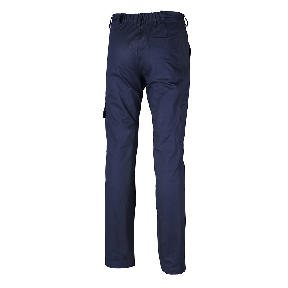 Pantalonii talie au doua buzunare laterale, un buzunar aplicat, cu scai, un buzunar de scule si unul la spate. Cusaturi de siguran?a, triple, de-a lungul ambelor laturi ale piciorului. Gaici largi, puternice, pentru curea, sli? cu fermoar. inchidere cu nasturi, inser?ie elastica in spate. Albastru royal, tercot 245 g/m?.