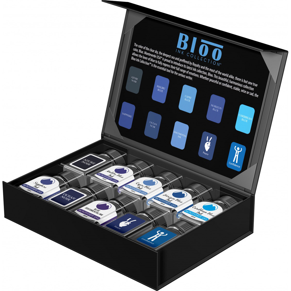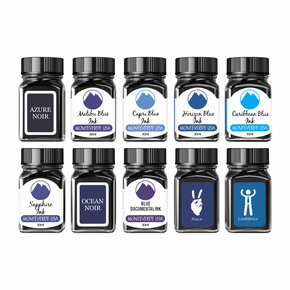 Acest set contine 10 calimari cu cerneala de 30 ml fiecare, parte din colectia Monteverde Bloo Ink Collection, ce ofera o varietate de nuante de albastru. Cernelurile sunt pe baza de pigment, asigurand o culoare intensa si permanenta, cu uscare rapida.
