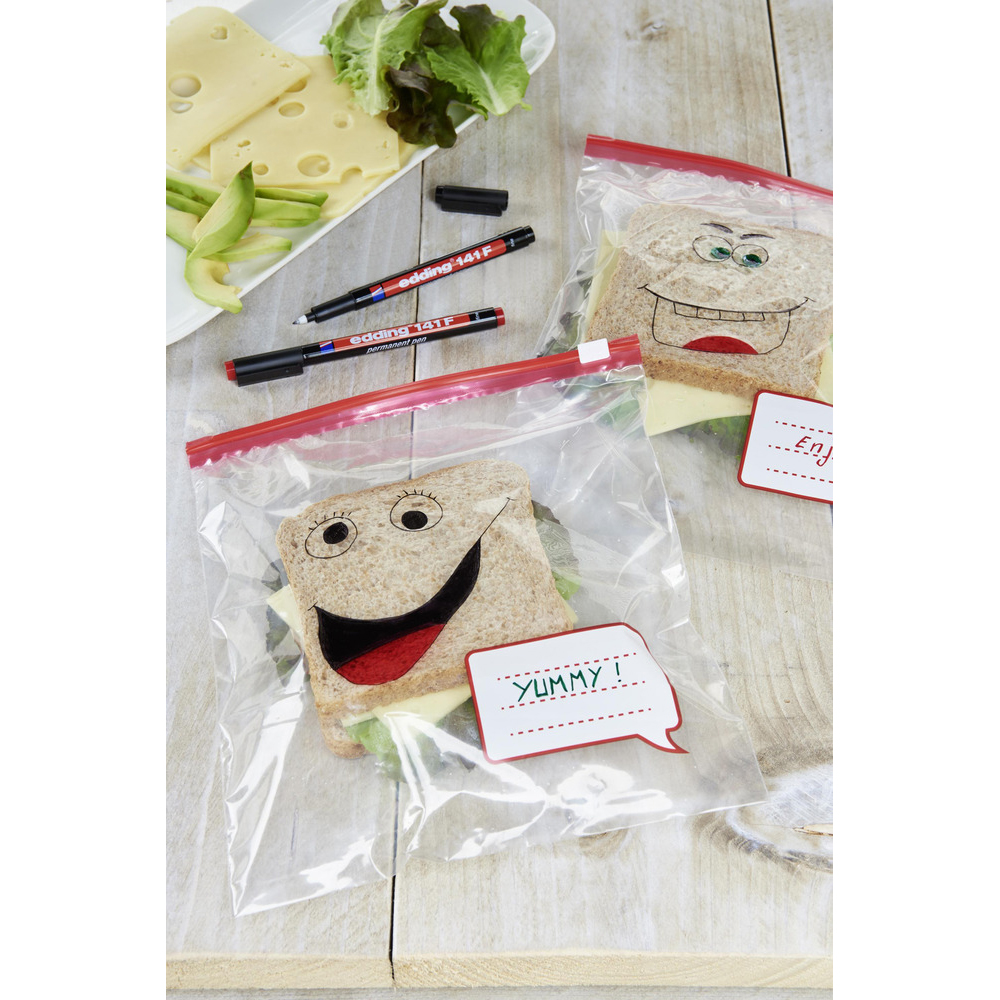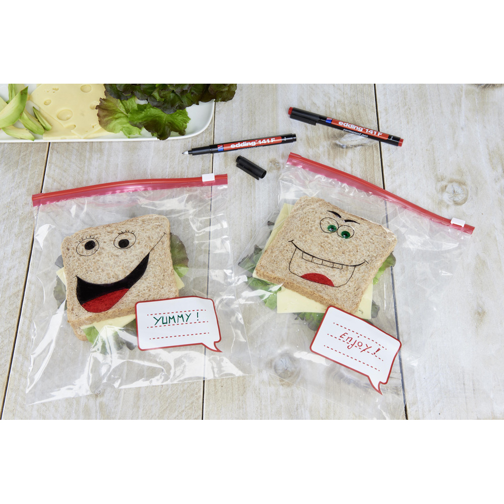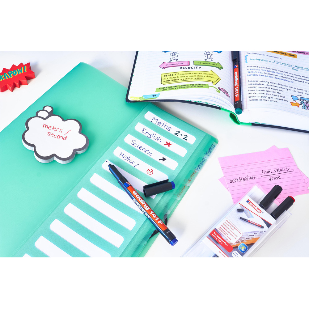 Markerul edding 141 F este disponibil in cinci culori intense, perfecte pentru lucrari creative sau etichetari fiabile. Capacul poate fi atasat la capatul corpului pentru a preveni pierderea acestuia, iar clema practica impiedica rostogolirea markerului si permite atasarea acestuia de haine sau obiecte.