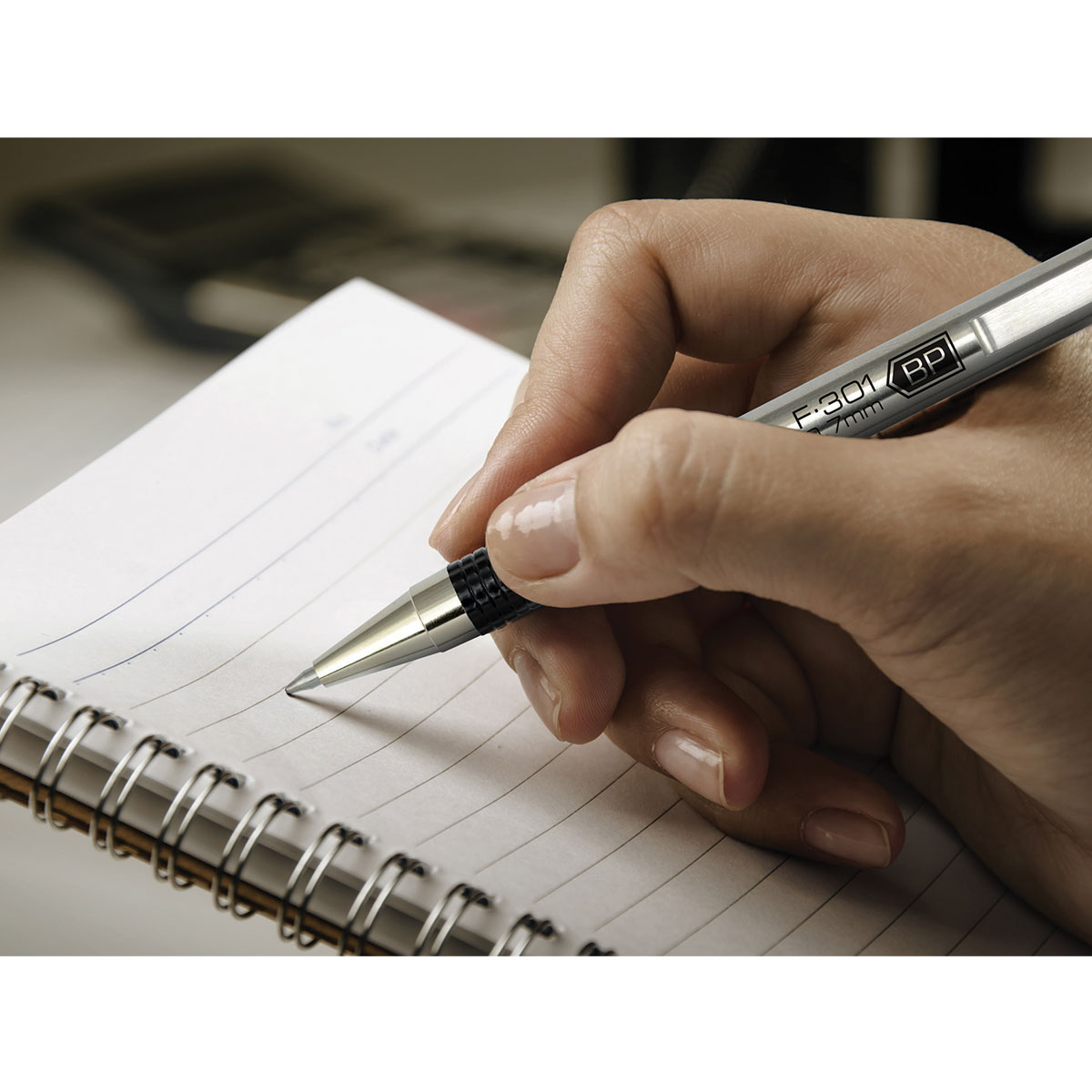 Imagineaza-ti ca esti asezat intr-o cafenea si iti notezi ideile inspiratiei cu F-301. Cu o simpla apasare a mecanismului cu buton, esti gata de scris, iar cu rezerva F de 0.24 mm lasi pe hartie un scris clar, curat, fara pete si fara intinderi.