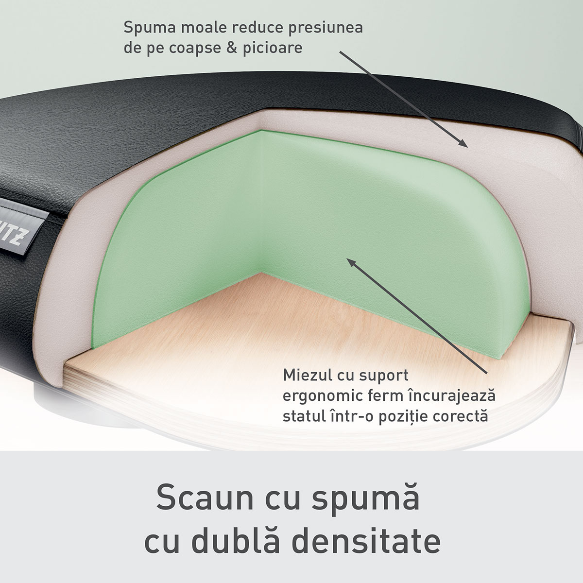 Scaunul ergonomic Leitz Ergo cu roti, cu spuma cu memorie confortabila, este conceput pentru a oferi confort ridicat si libertate de miscare pe tot parcursul zilei de lucru. Designul triunghiular tip „sa” al sezutului ajuta la distribuirea uniforma a greutatii si incurajeaza o postura corecta, reducand presiunea asupra coapselor si picioarelor.