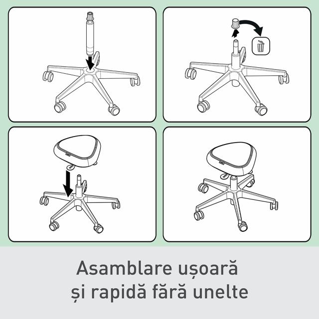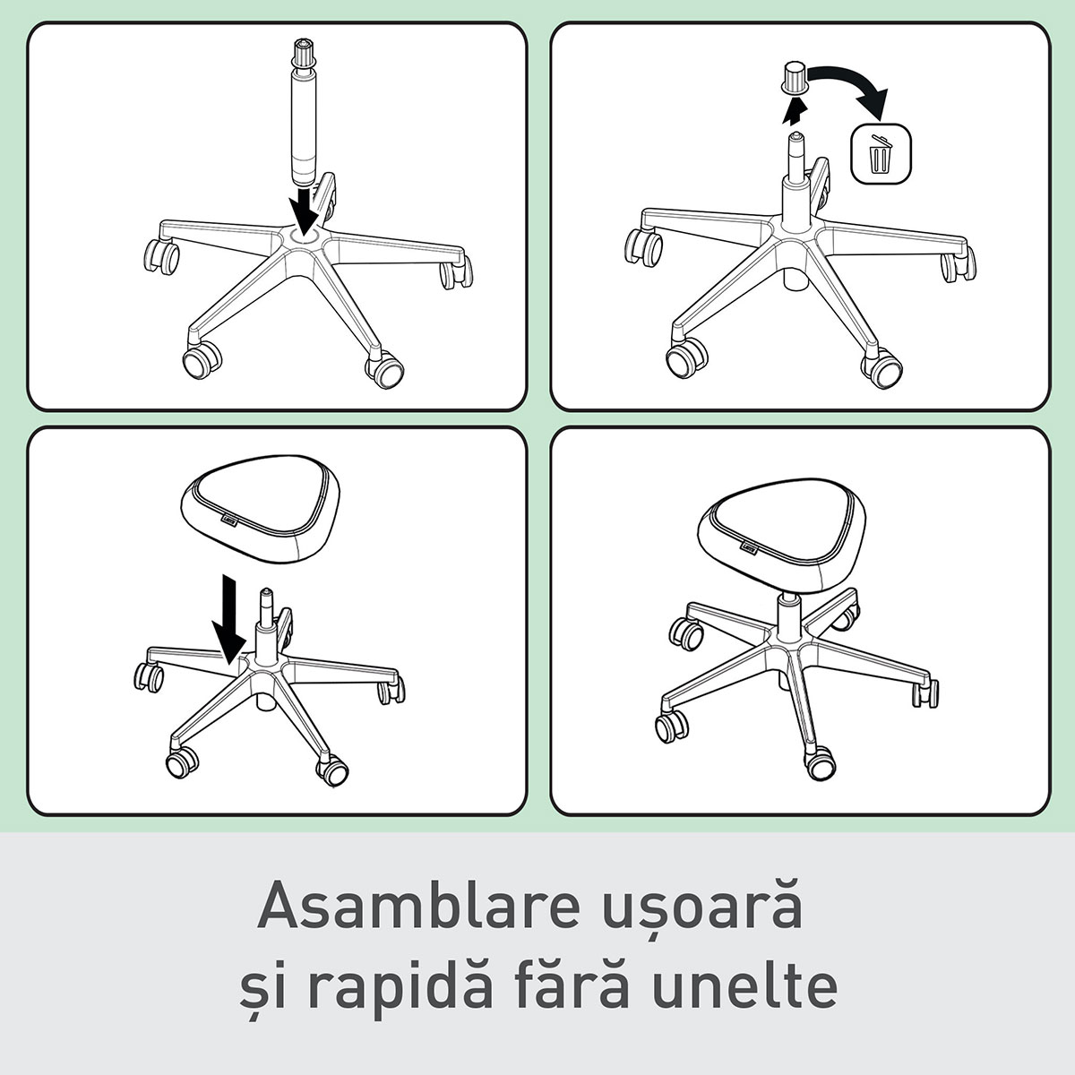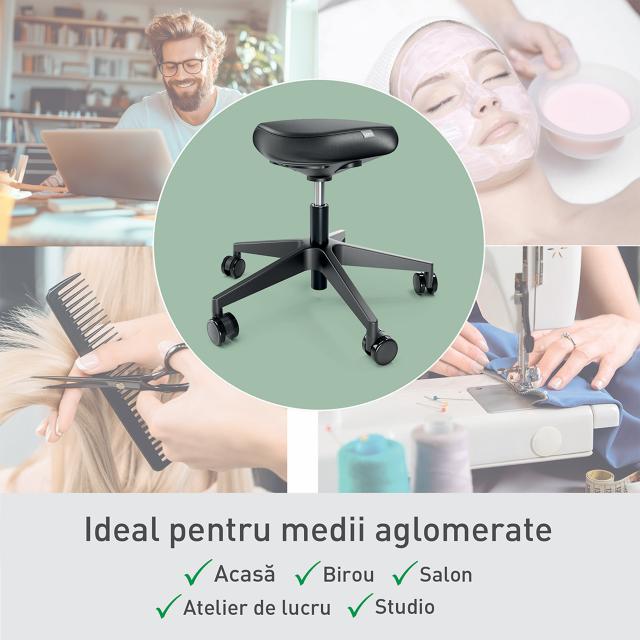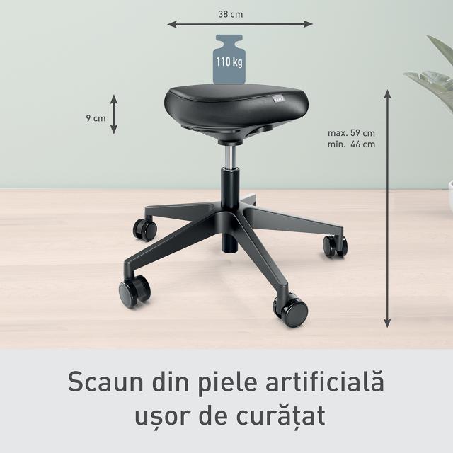 Caracteristici principale: - Șezut confortabil cu spumă DDF (Dual Density Foam) - Forma triunghiulară tip șa încurajează o poziție de ședere dreaptă, contribuind la reducerea durerilor de spate și îmbunătățirea posturii. - Echipat cu 5 roți pivotante la 360°, stabile și potrivite pentru toate tipurile de pardoseli, cu sistem de rezistență crescută când nu este utilizat. - Trei butoane de reglaj accesibile sub șezut permit ajustarea rapidă și confortabilă a înălțimii în funcție de utilizator și poziția de ședere - Scaun din piele artificială lavabilă, ușor de curățat, ideal pentru medii profesionale; bază lată de 60 cm pentru stabilitate sporită, cu certificări GS și TÜV.