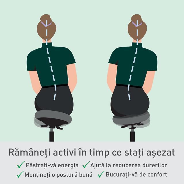 Caracteristici principale: - Șezut confortabil cu spumă DDF (Dual Density Foam) - Tehnologie DSM (Dynamic Spine Motion) 360° – permite înclinarea în orice direcție, încurajând mișcarea naturală, postura corectă și activarea mușchilor trunchiului. - Reglare ușoară a înălțimii (47–60 cm) – cu 3 manete accesibile din orice poziție de ședere. - 5 roți pivotante cu rezistență automată – oferă mobilitate pe toate tipurile de podele și previn mișcarea accidentală atunci când scaunul nu este ocupat. - Certificări IGR, TÜV și GS + husă 100% reciclată – testat pentru ergonomie și siguranță, prietenos cu mediul și potrivit pentru utilizare zilnică la birou sau acasă.