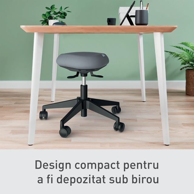 Scaun activ pe roți, elegant și ergonomic, care te menține în mișcare și confortabil, cu o bază mai lată de 60 cm pentru stabilitate crescută, certificat TÜV și GS (siguranță testată în Germania)