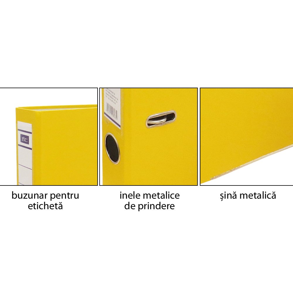 Biblioraft din carton, plastifiat exterior, prevazut cu mecanism metalic nichelat si margine metalica pentru protejarea colturilor. Dispune de buzunar din plastic pentru etichete interschimbabile si inel de prindere metalic pe cotor.