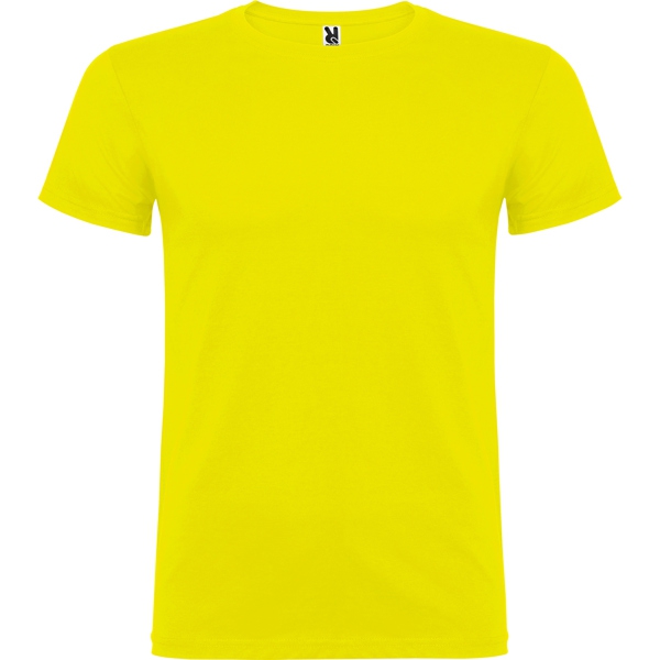 Tricou cu maneca scurta ?i guler rotund dublu cu elastan, confectionat din material tubular (fara cusaturi) pentru adulti, culoare galben. Material: 100% bumbac, punct neted, 155 g/m?. Are banda intarita pentru acoperirea cusaturii la guler.
