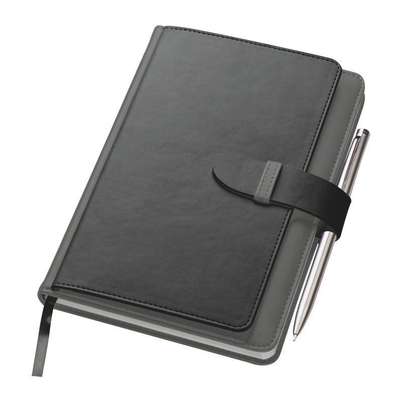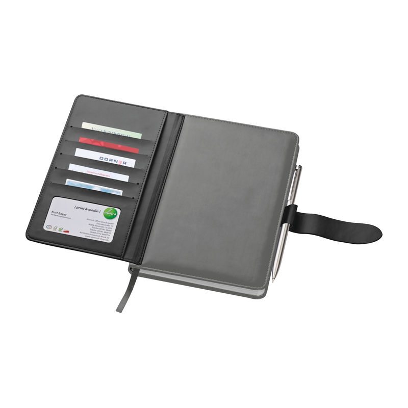 Bloc notes gri A5 cu 256 de pagini liniate coperta captusita si spatiu pentru 6 carti de vizita