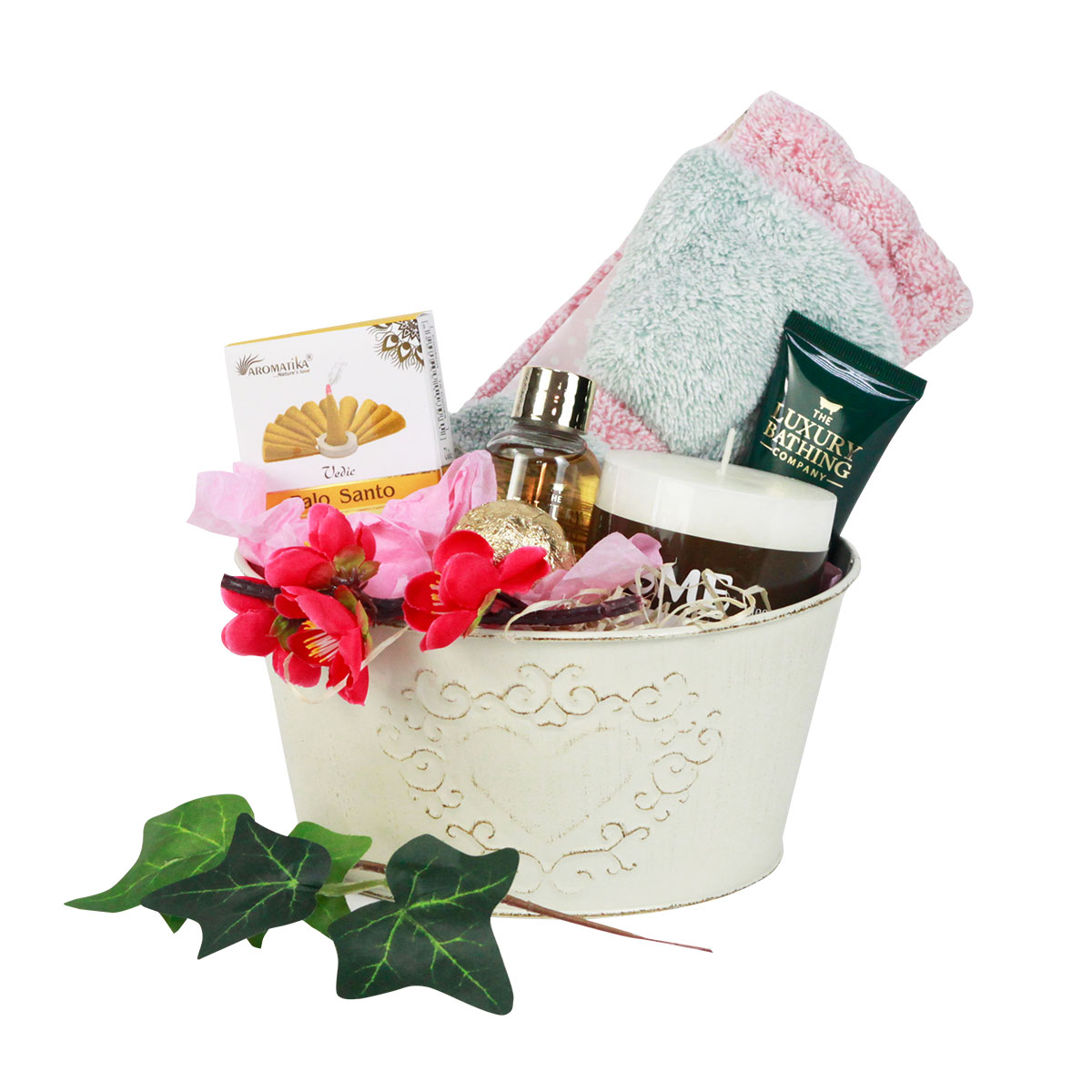 • Vas metalic diverse culori Bentita SPA Set Luxury Bathing: gel de dus 50ml, crema de maini 50ml, bila efervescenta de baie Paolo Santo conuri + suport aromaterapie Lumanare decorativa Ambalare in punga craft color cu hartie matase