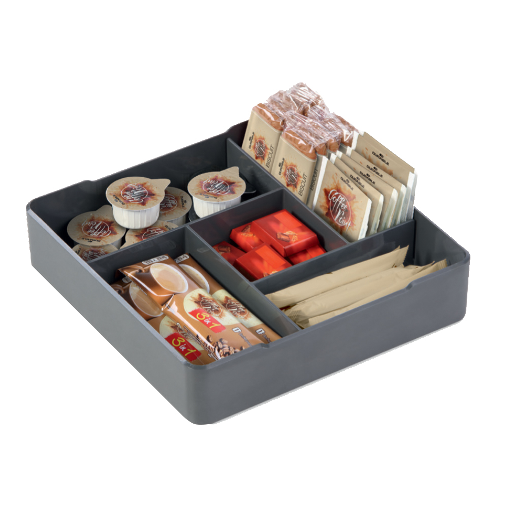 Suportul de depozitare Coffee Point este foarte practic, avand compartimente distincte pentru ceai, cafea, zahar, betisoare sau alte gustari. Alimentele sunt pastrate in conditii de siguranta in acest suport. Acest suport de depozitare se poate spala la masina de spalat vase. Este un produs rezistent si durabil in timp. Se utilizeaza cu usurinta. Este alcatuit din materiale de calitate inalta.
