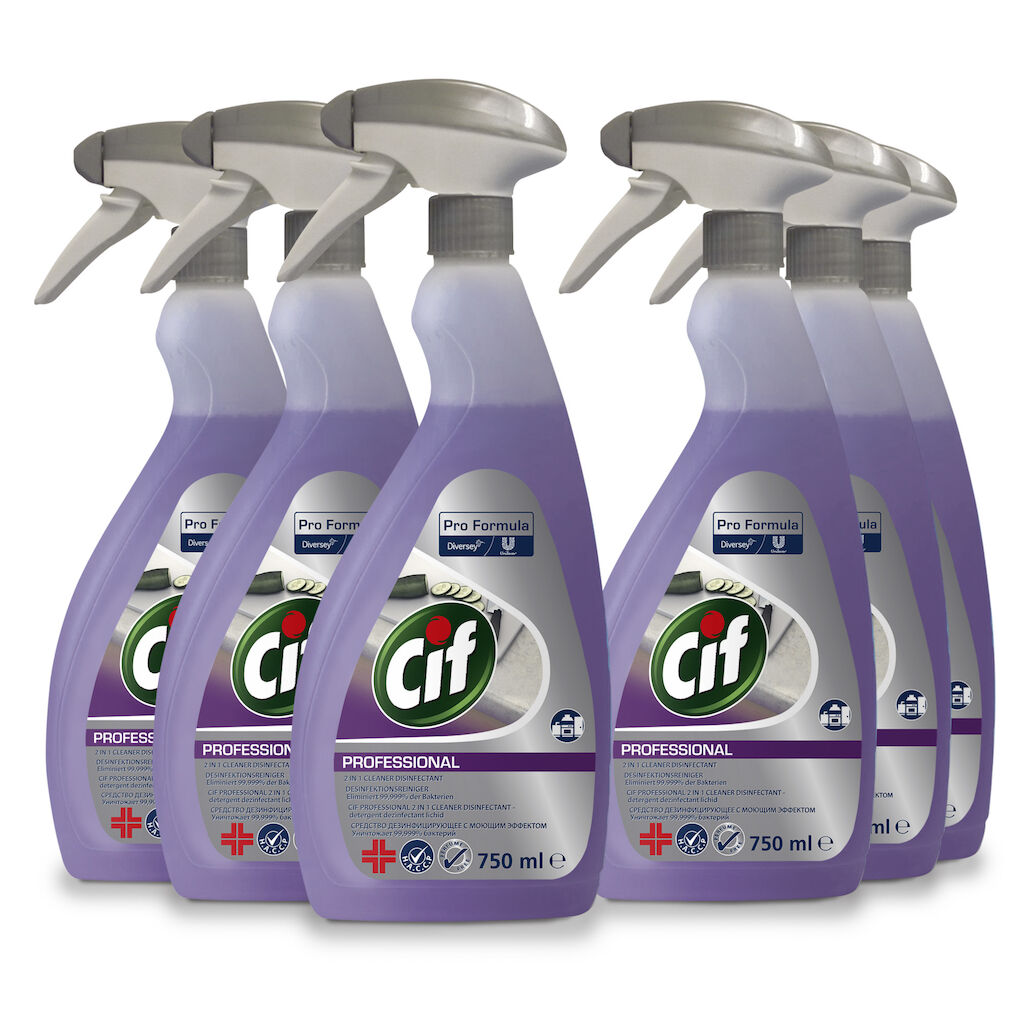 Cif Professional detergent dezinfectant 2in1 pentru curatarea si dezinfectarea suprafetelor multiple, nu necesita clatire. Adecvat pt suprafete dure (gresie, faianta, parchet, linoleum, lemn, metal etc.), fara continut de clor, eficient impotriva unei game largi de microorganisme, bacterii, ciuperci si virusi, in toate conditiile de duritate a apei, indepartand grasimea si resturile alimentare uscate. Nu deterioreaza si nu ataca suprafetele; nu irita pielea si caile respiratorii. Nu contine clor si nu are miros sau parfum. Produs gata de utilizare, se aplica direct pe suprafete, nu necesita diluare; Curatarea si dezinfectarea suprafetelor lavabile si generale in unitati de invatamant, crese, bucatarii, institutii publice; Uz general in institutii publice si in industria alimentara, fara echipament specializat. Utilizat de nespecialisti / neprofesionisti EN 1276 si EN 1650 conform SR EN 14885