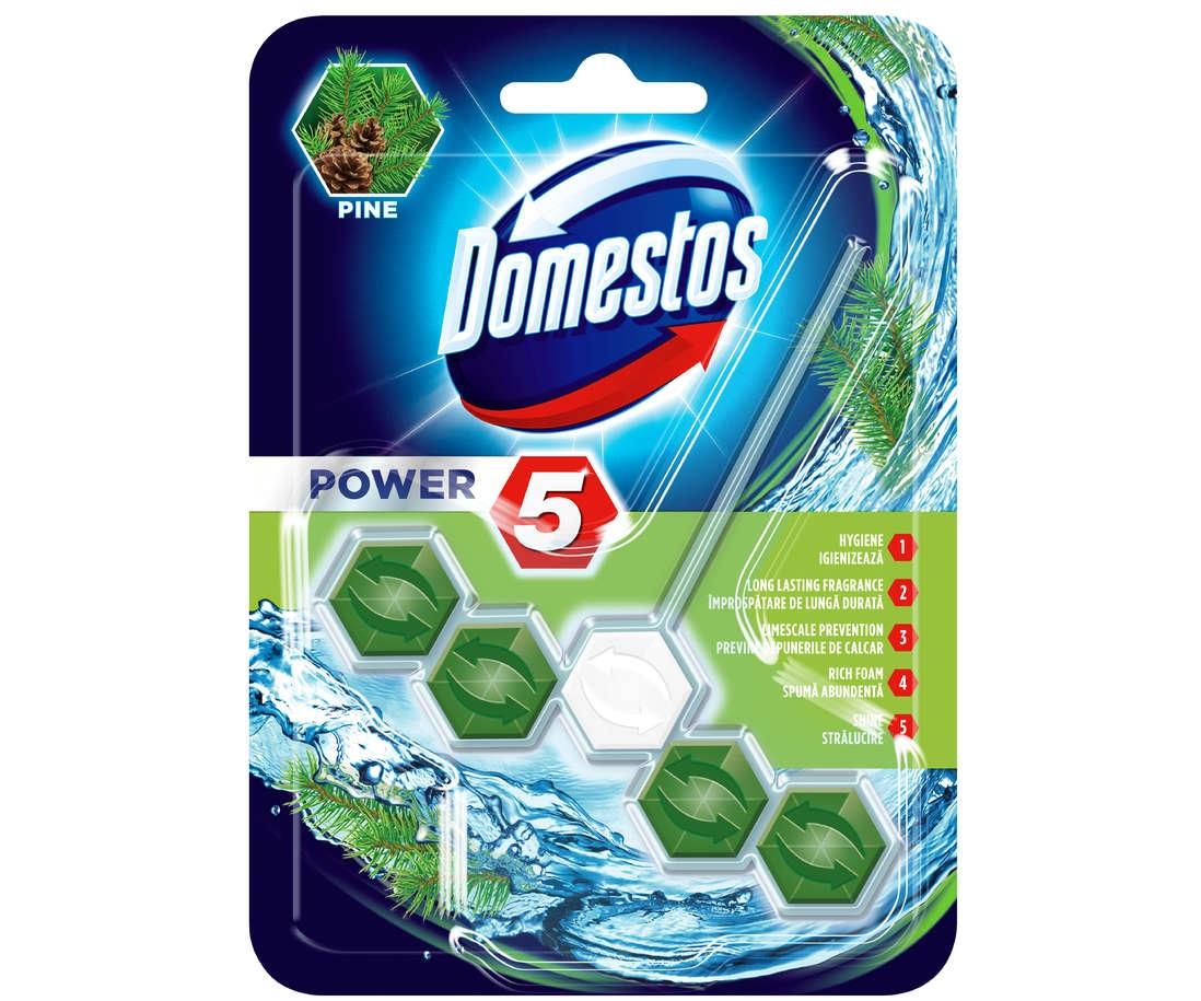 Odorizantul pentru toaleta Domestos Power 5 igienizeaza si confera stralucire, improspatare de lunga durata, previne depunerile de calcar.Domestos Power combina cele 5 atribute ale unui odorizant de toaleta complet:- Miros placut de lunga durata- Spuma bogata- Confera stralucire vasului de toaleta- Previne depunerile de calcar- Curata si igienizeaza protejand impotriva microbilor