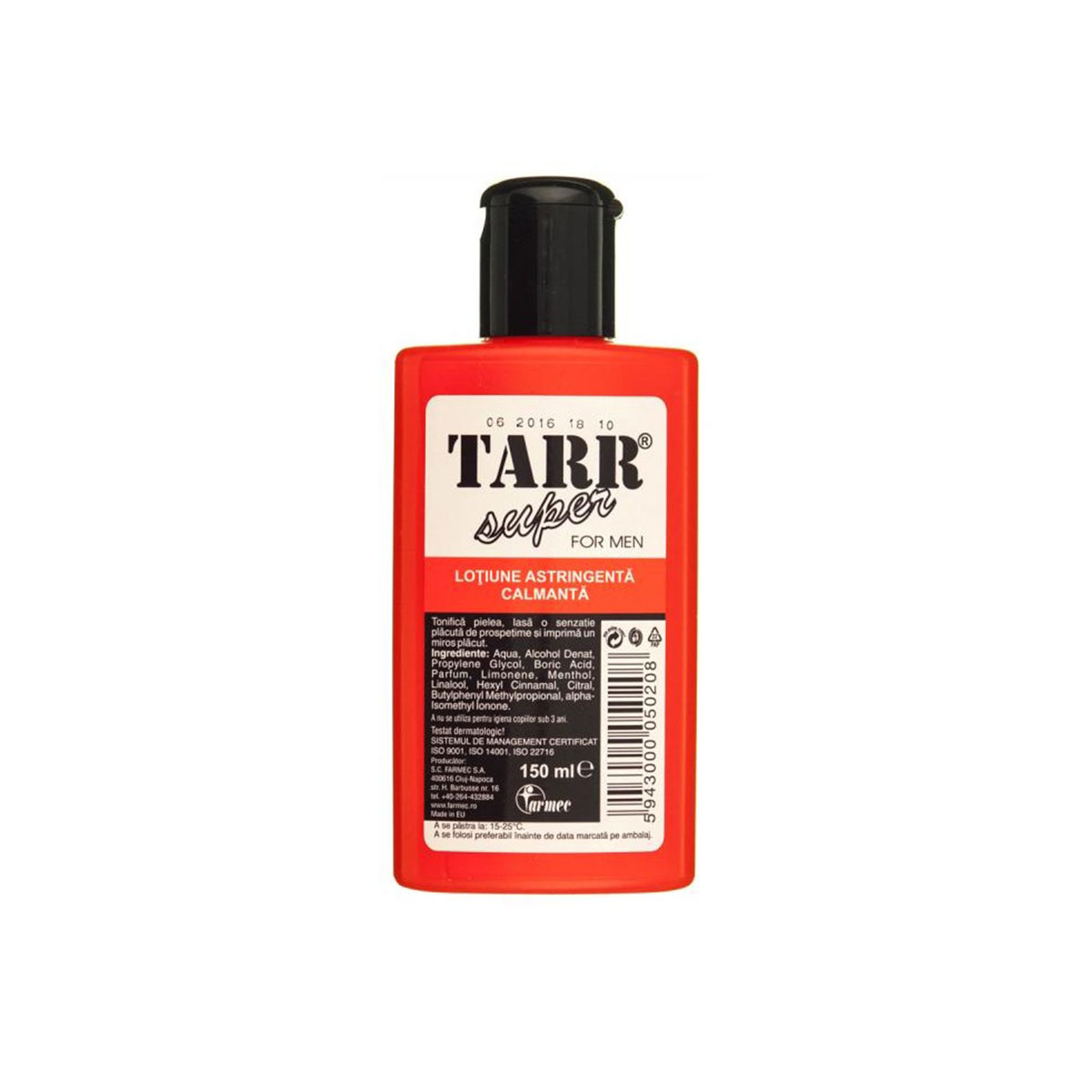 Lotiunea Astingenta Tarr este o marca de traditie pe piata romaneasca a produselor de ingrijire pentru barbati, care s-a mentinut datorita proprietatilor sale, dar si datorita raportului calitate-pret corect.Lotiunea astringenta calmanta Tarr Super tonifica pielea, calmeaza iritatiile aparute dupa ras si lasa o senzatie placuta de prospetime.Dupa folosirea lotiunii astringente calmante, pielea dumneavoastra va fi tonifiata, fara iritatii aparute in urma barbieritului.Mod utilizareSe aplica dupa fiecare barbierit, efectuand un masaj usor al pielii.
