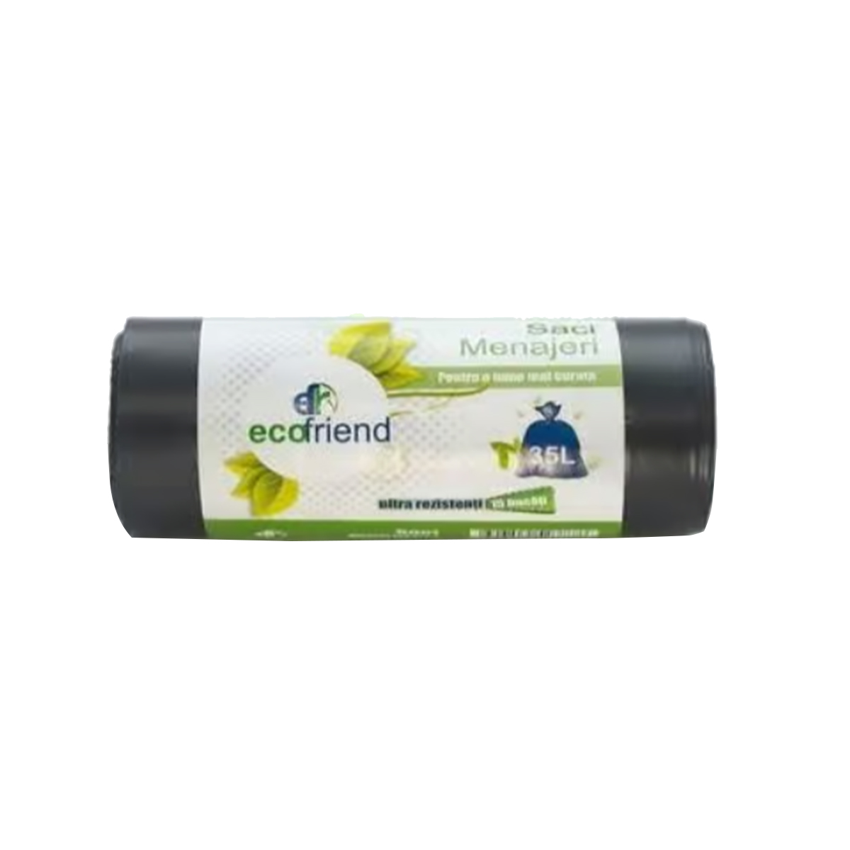 Saci menajeri ultrarezistenti prevazuti cu snur ecologici, realizati din material 100% reciclat. Sunt foarte utili si mult mai usor de manuit, datorita snurului care poate fi folosit drept maner, dupa strangere. Suporta o cantitate considerabila de deseruri si resturi menajere
