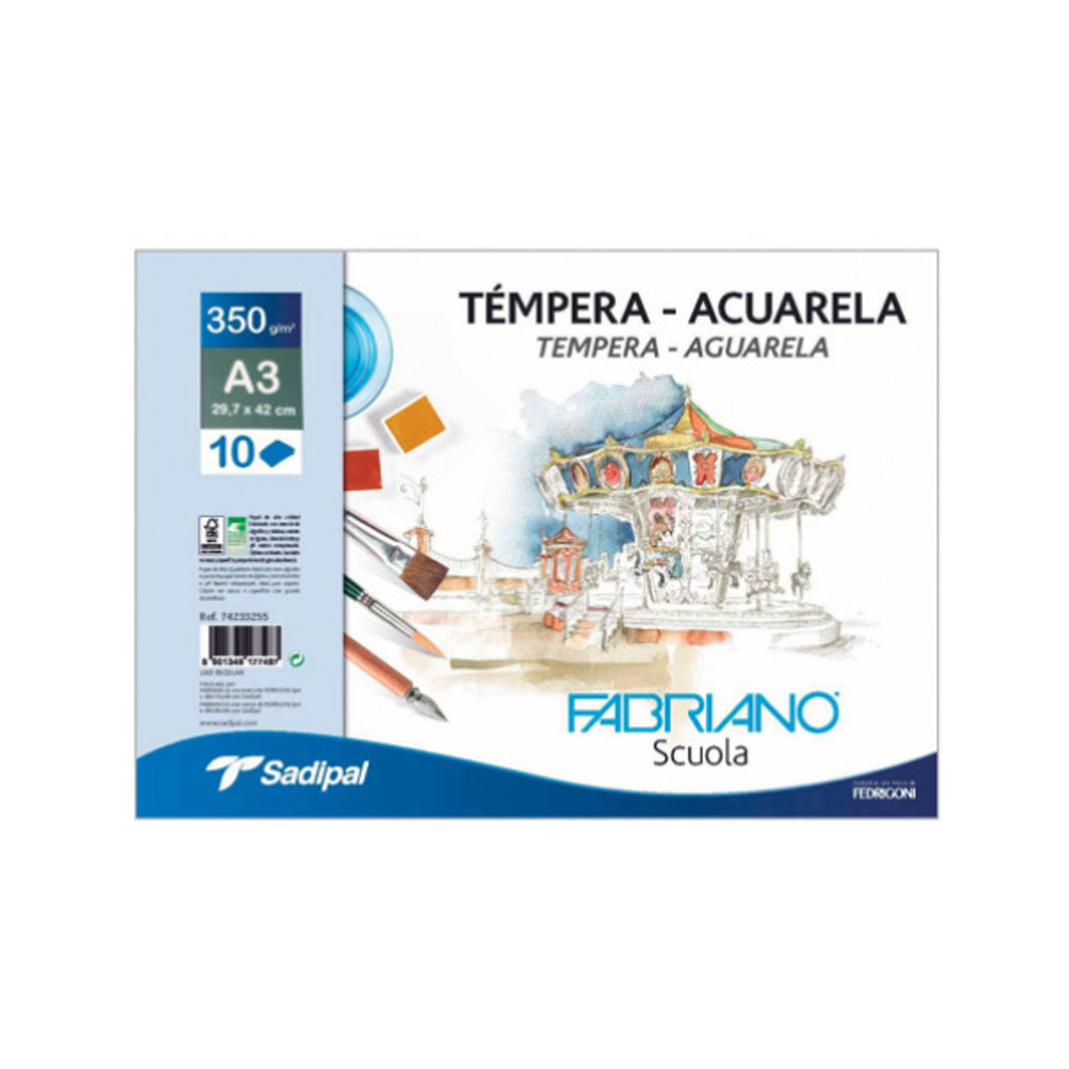 Bloc Fabriano Scuola pentru acuarela, cu hartie de 350 g/mp, cu textura speciala pentru absorbtia controlata a apei si a pigmentilor. Ideal pentru acuarela, tempera si alte tehnici umede. Asigura stabilitate si rezultate uniforme. Produs certificat FSC.