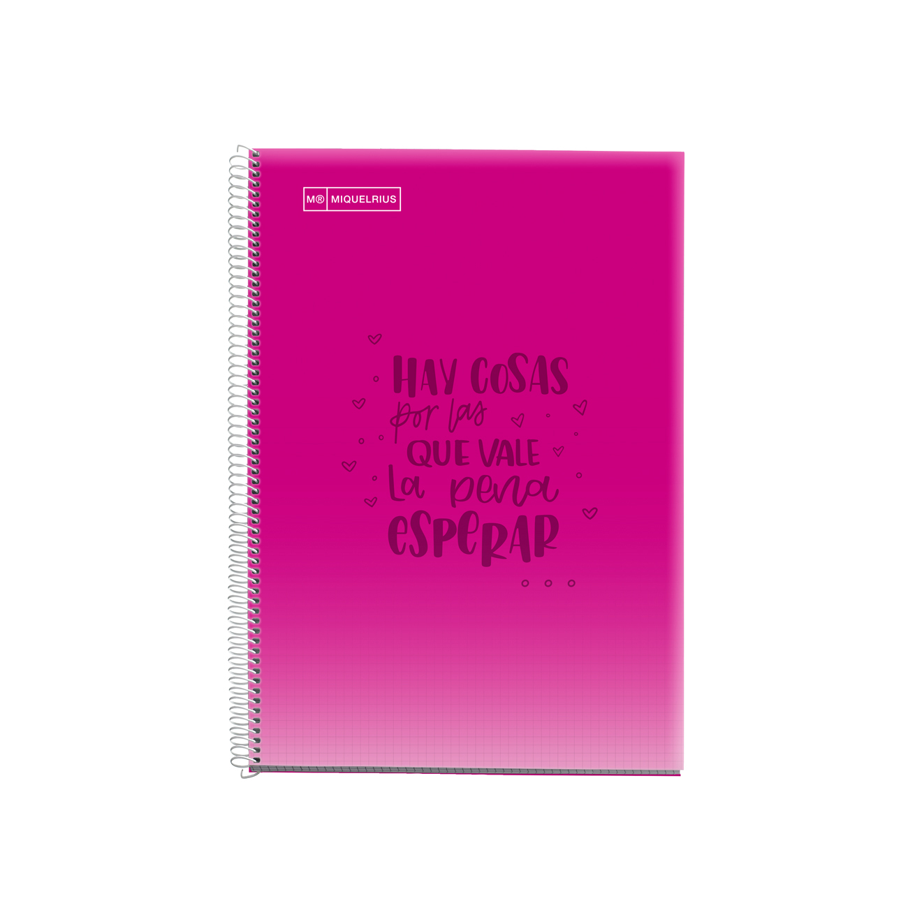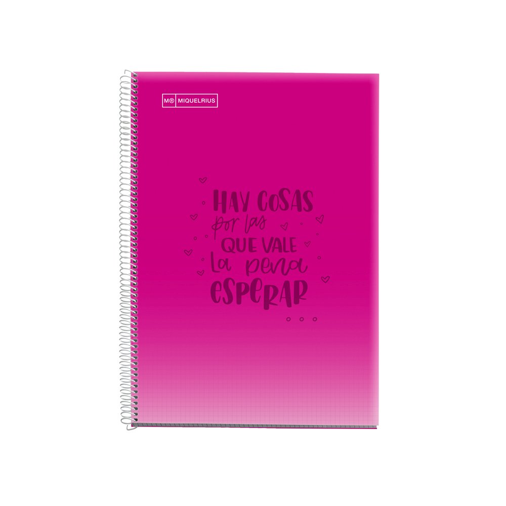 Caiet cu spira Miquelrius Messages A4 mate 80 file, magenta, coperti translucide de polipropilena de 0,8 mm. Prima foaie cu proba de fraza si grila. Hartie extra-opaca?90 g. Certificare: Credit FSC Mix