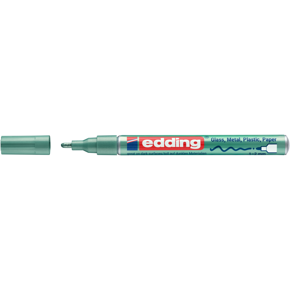 Markerul Edding 751 lucios cu vopsea in nuanta verde metalic este alegerea ideala pentru scrierea opaca si permanenta pe suprafete netede, chiar si pe materiale transparente sau intunecate, cum ar fi sticla, metalul, plasticul si hartia acoperita. Acest marker dispune de o varf rotund cu o latime de scriere de 1-2 mm, oferind un flux uniform de cerneala pentru o aplicare usoara si curata.