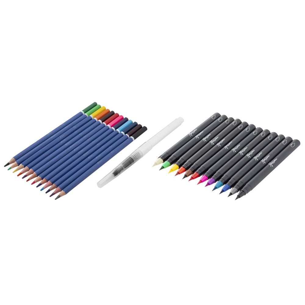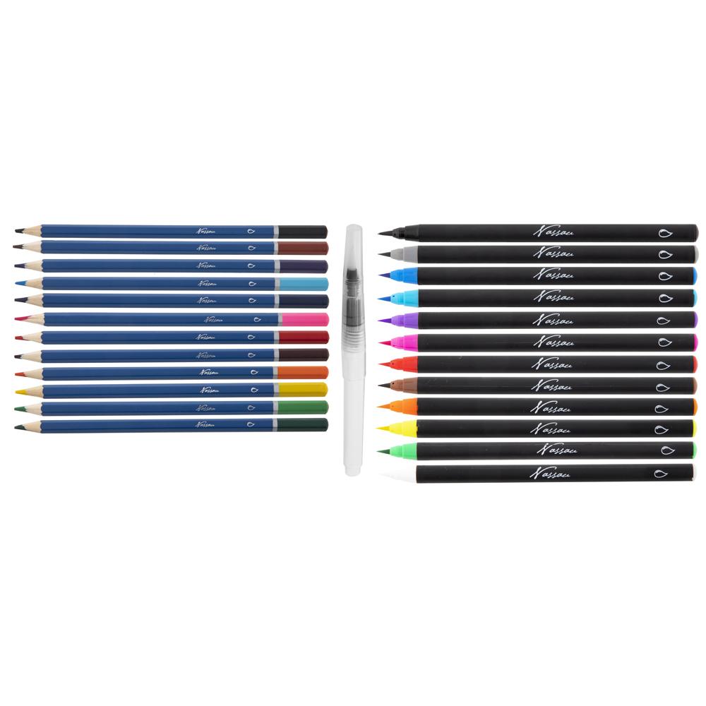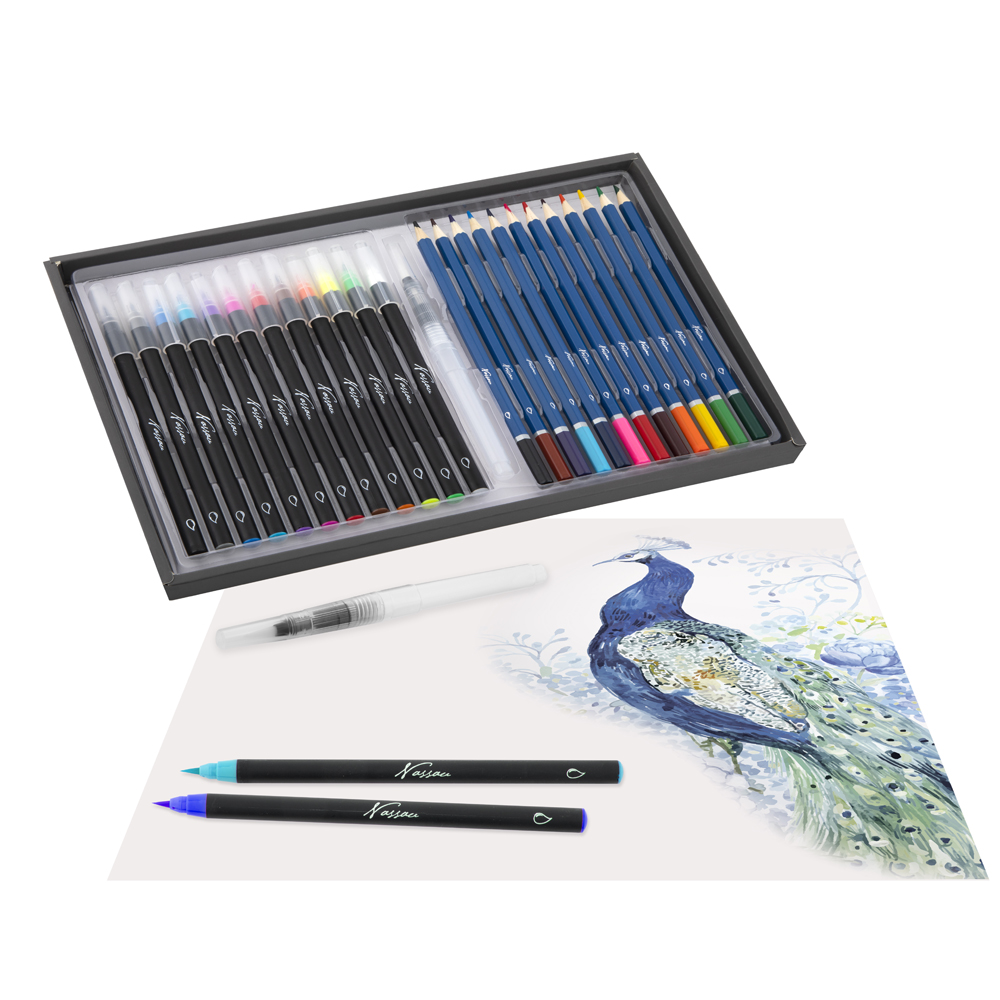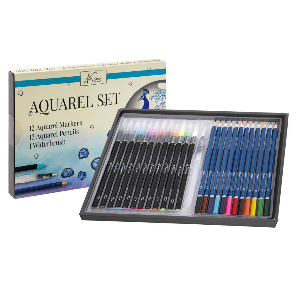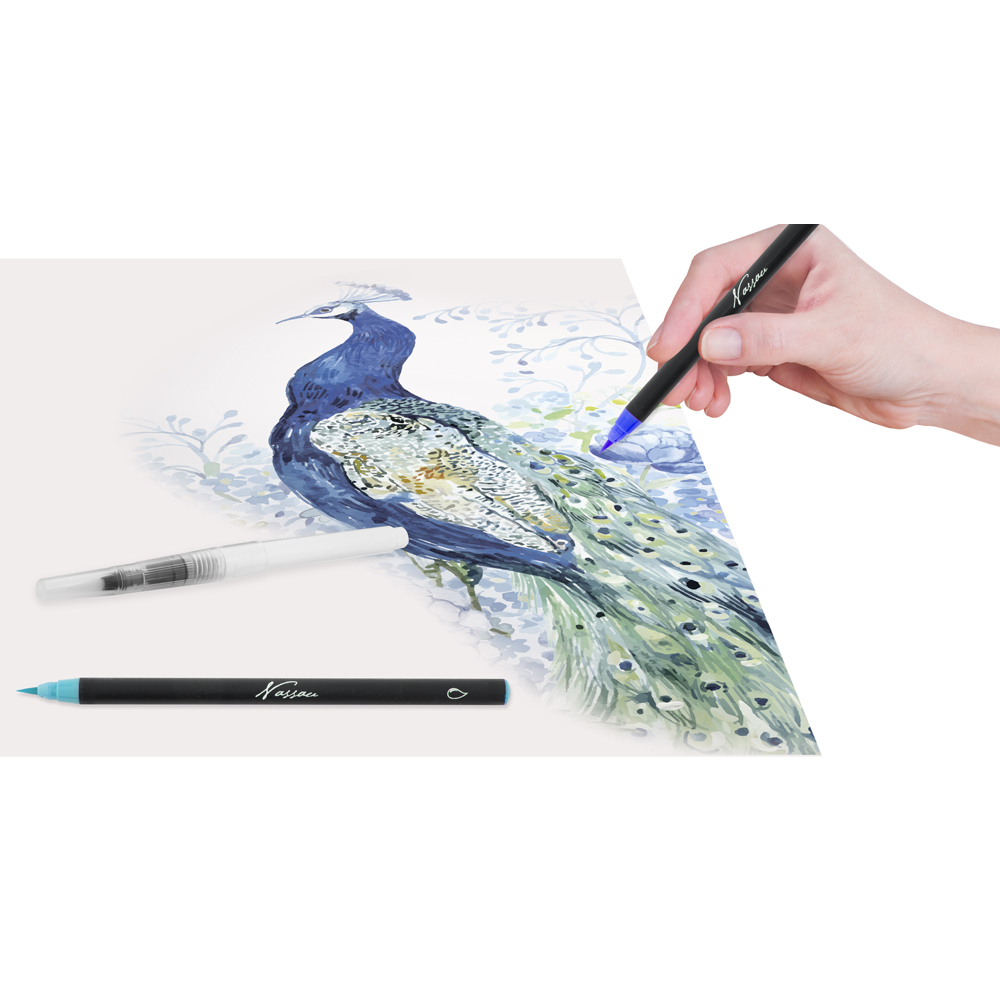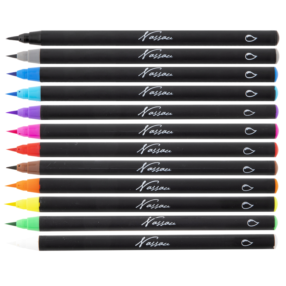 12 markere in diverse culori, cu varf tip pensula12 creioane colorate acuarelabile1 pensula plastic cu rezervorMarkerele acuarelabile cu varf tip pensula Nassau Fine Art sunt o modalitate moderna de a picta in acuarela. Nu este nevoie de amestec cu apa. Poti trece direct la pictat.