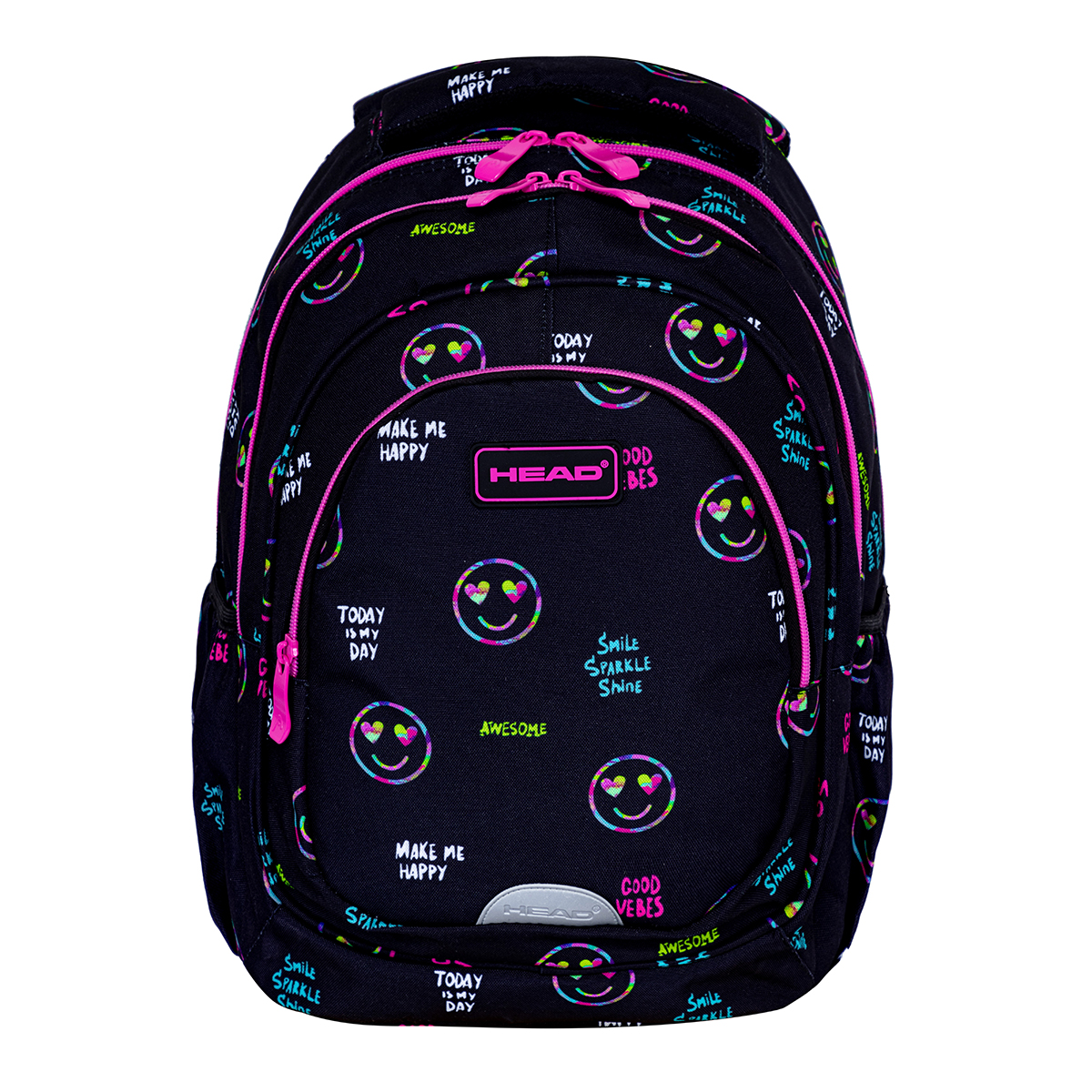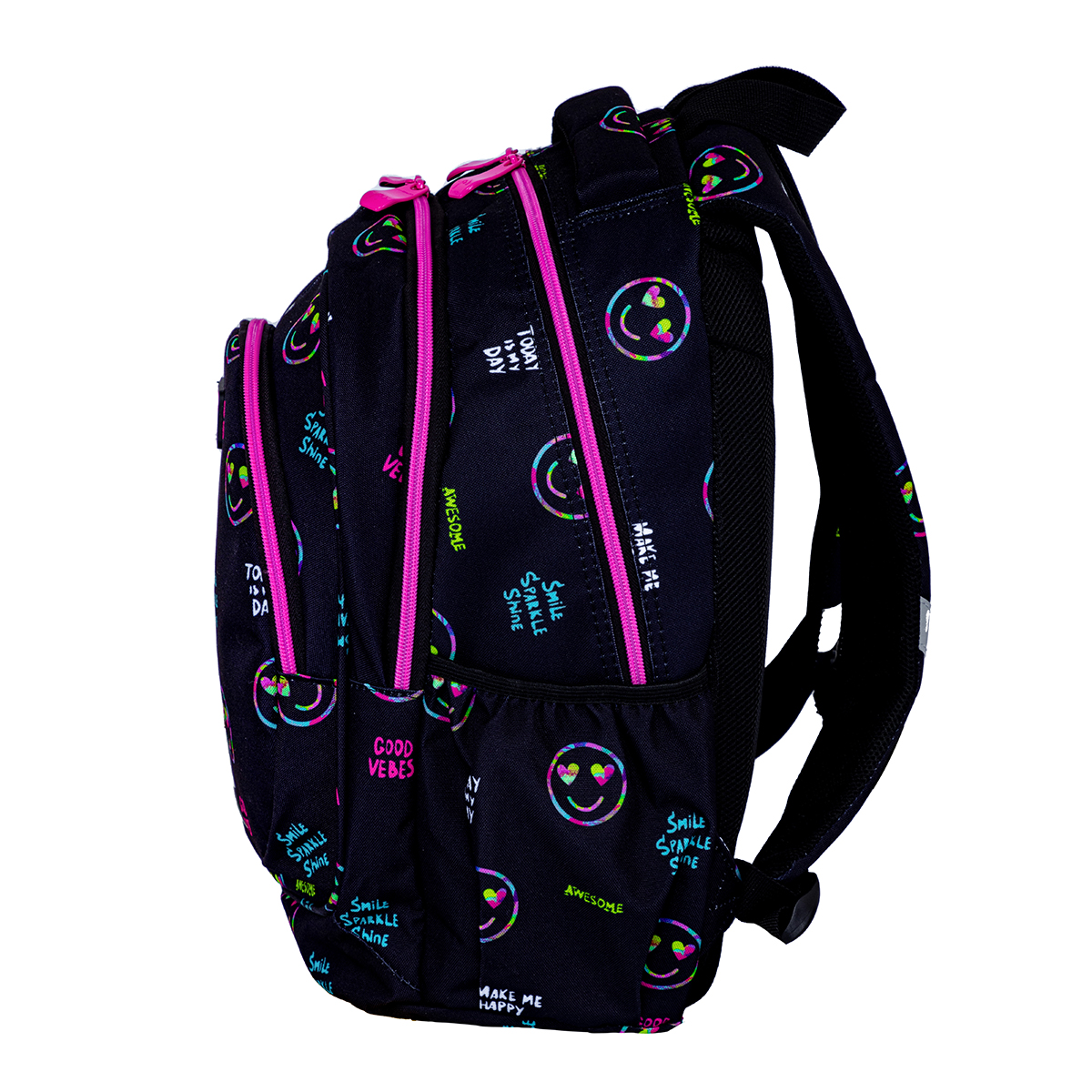 Ghiozdanul cu design vesel si pozitiv, perfect pentru cei care apreciaza creativitatea si optimismul in activitatile zilnice. Modelul sau atragator cu inscriptia SMILE SPARKLE SHINE aduce un plus de energie si bucurie in fiecare zi.