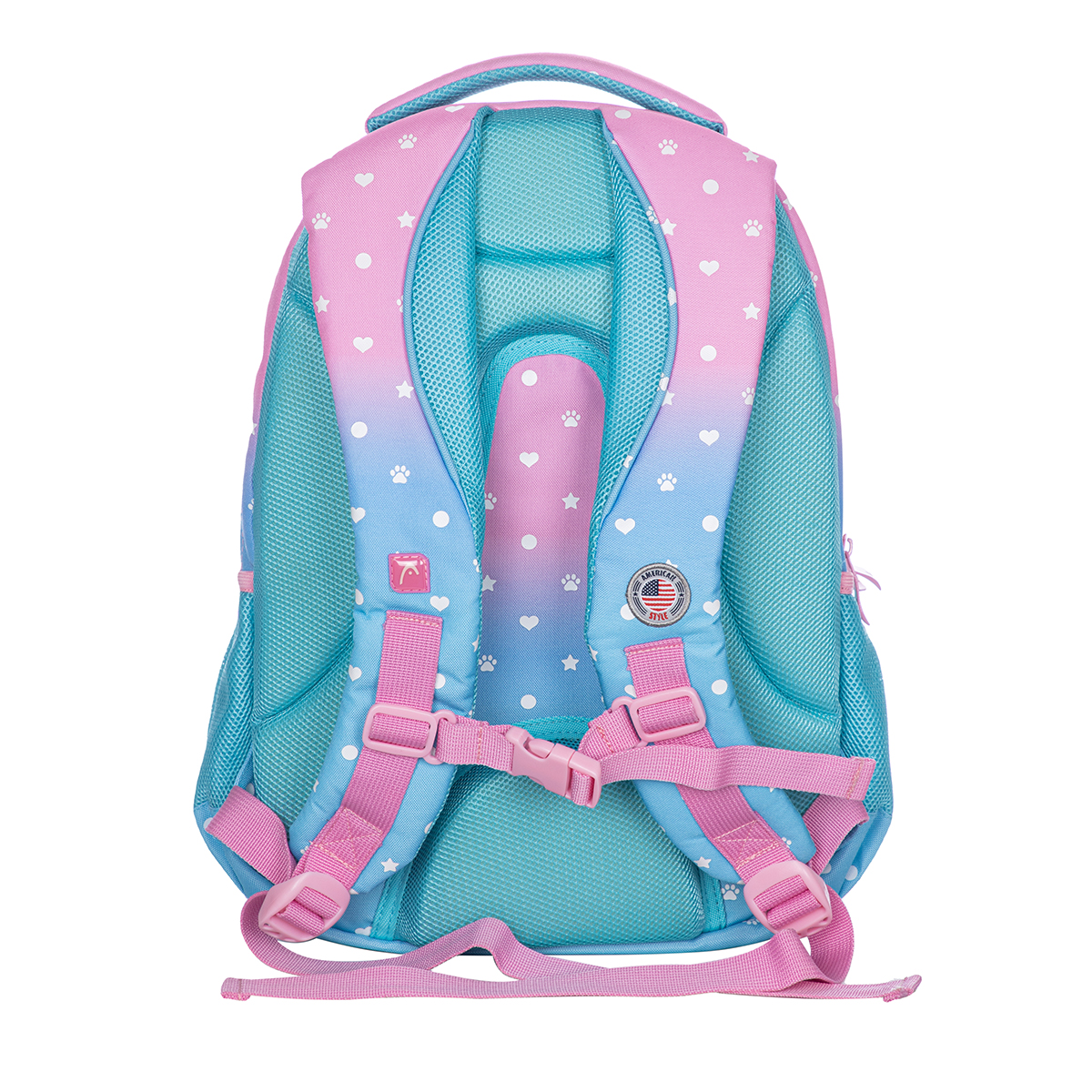 Ghiozdanul cu patru compartimente este alegerea perfecta pentru elevii romantici, avand un design captivant in culori ombre roz si bleu, impodobit cu inimi albe si labute de caine. Este dotat cu patru camere functionale, fiecare echipata cu buzunar practic si organizator pentru obiecte mici.