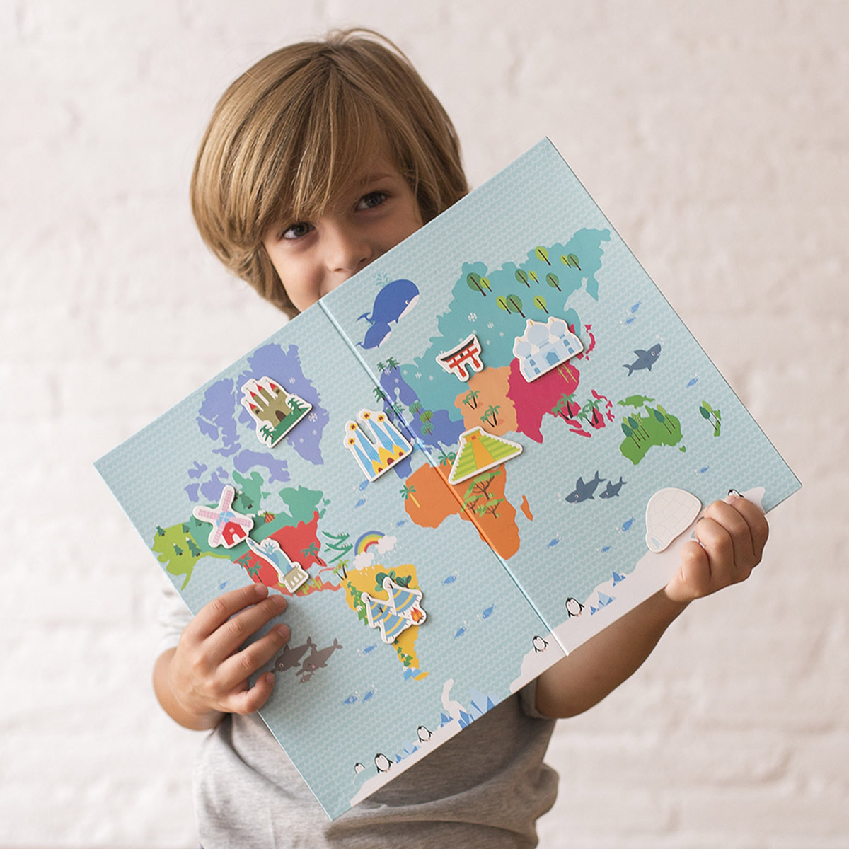 Joc magnetic model Harta Lumii pentru ca cei mici sa invete sa plaseze pe harta o multime de monumente si animale. Fiecare set contine: 1 plansa magnetica pliabila de 36 x 28 cm pentru a se potrivi in baza cutiei si 40 de magneti cu desene de monumente si animale. Design exclusiv APLI Kids cu ilustratii originale si colorate. Un joc cu o mare valoare educativa: incurajeaza observatia si imaginatia, creste concentrarea si atentia, genereaza interes pentru obiecte, animale si personaje pe care nu le cunosc. Dimensiuni plansa: 36 x 28 cm.