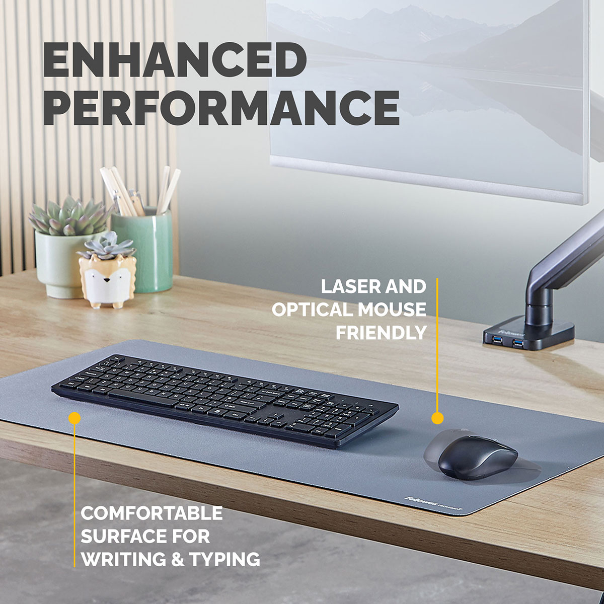 Suportul mare pentru birou protejeaza suprafata de lucru impotriva murdariei si zgarieturilor si ajuta la crearea unui spatiu fara reflexii. Ofera o suprafata confortabila pentru scris si tastat, contribuind in acelasi timp la imbunatatirea performantei mouse-ului.