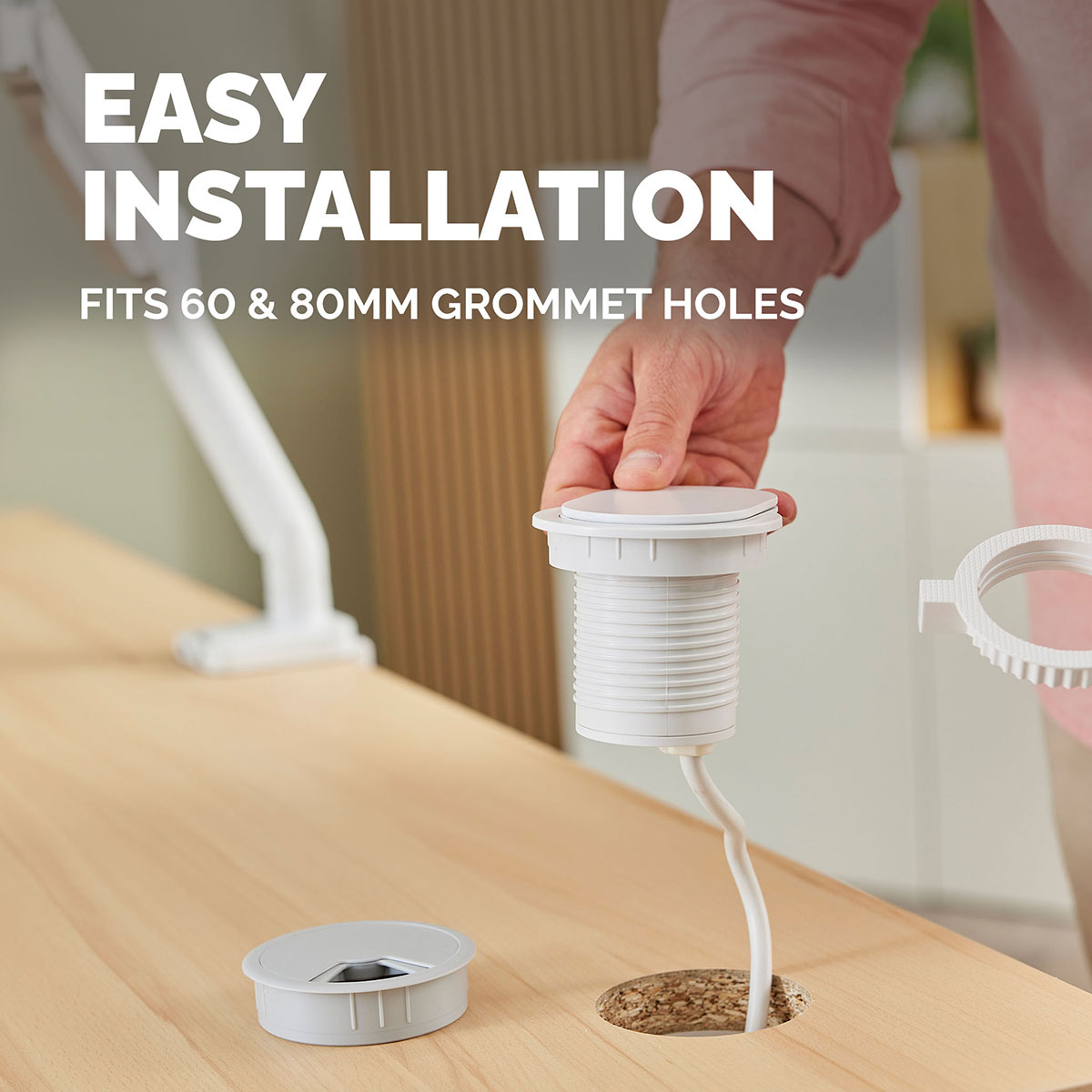 Integreaza alimentarea si incarcarea dispozitivelor direct in birou, cu o priza multipla discreta si usor accesibila, conceputa pentru un spatiu de lucru mai ordonat. Se monteaza simplu in orificiul pentru cabluri, eliminand nevoia de prelungitoare voluminoase si reducand cablurile la vedere.