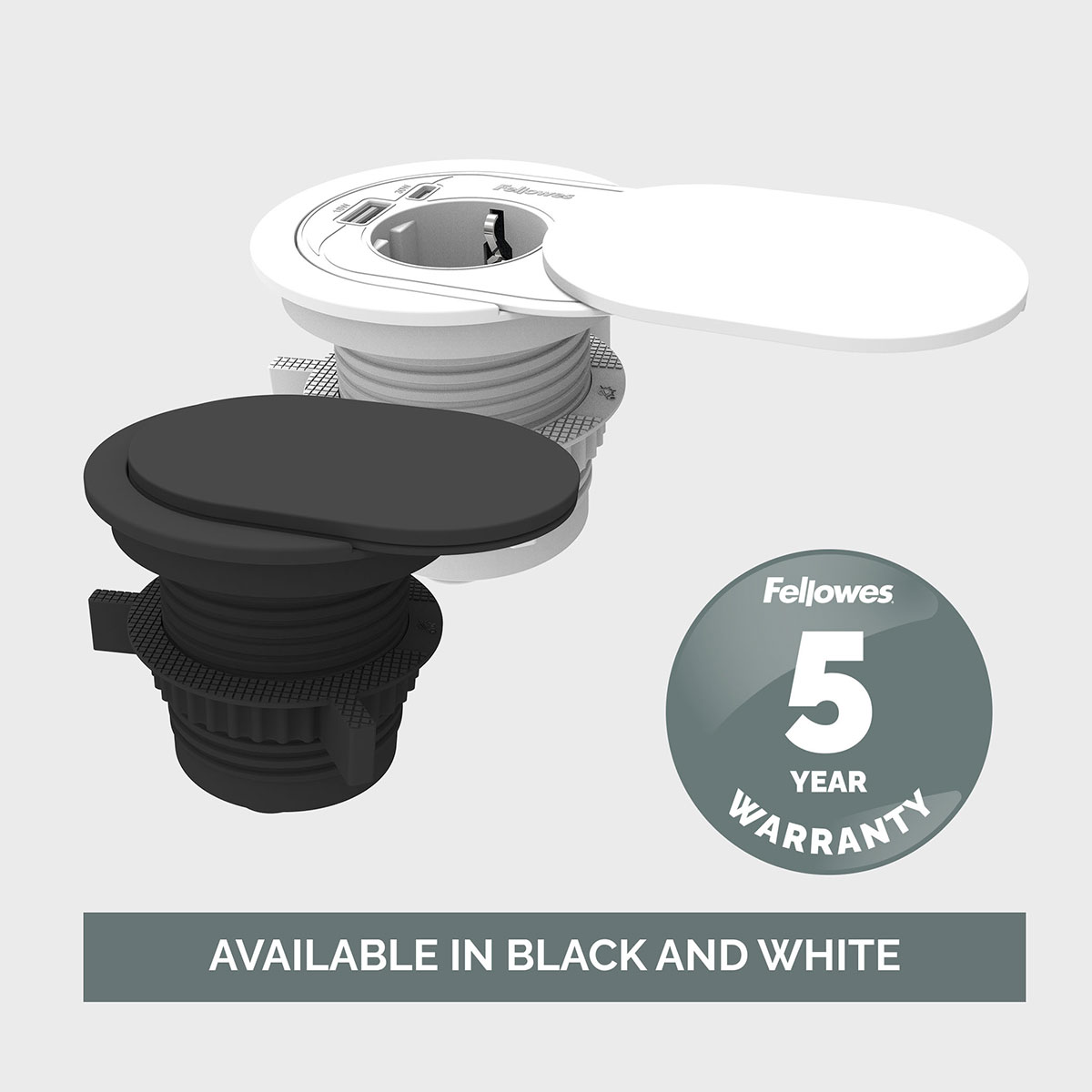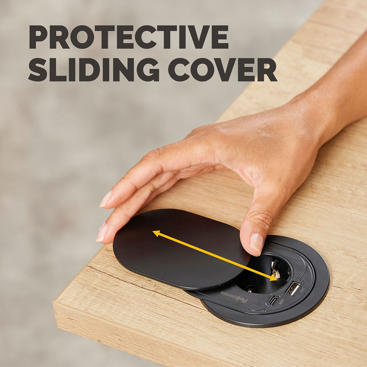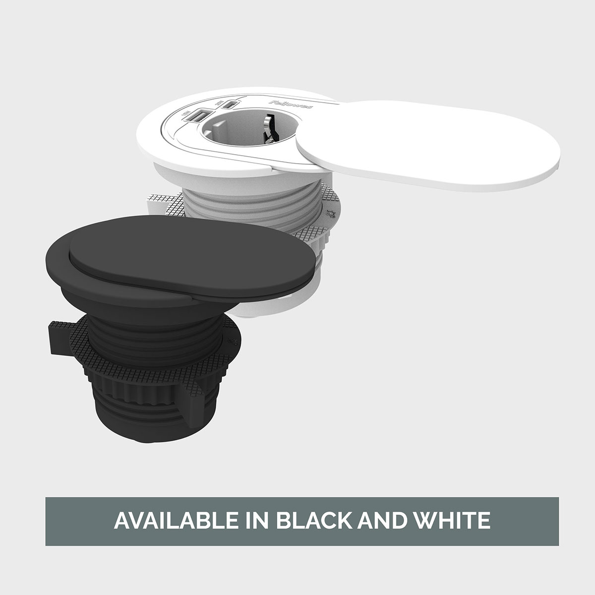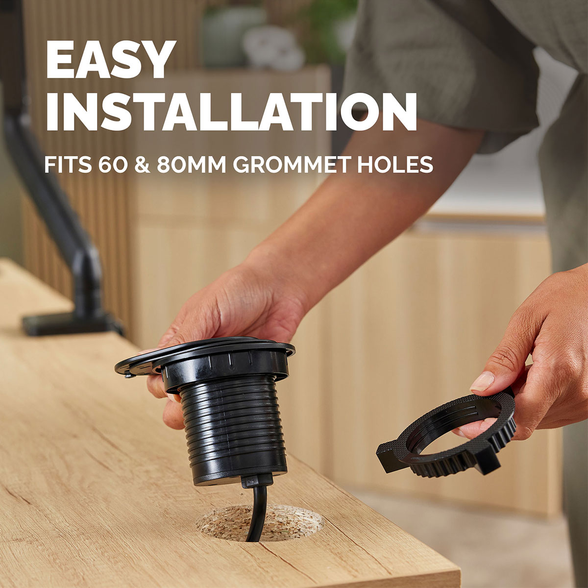 Integreaza alimentarea si incarcarea dispozitivelor direct in birou, cu o priza multipla discreta si usor accesibila, conceputa pentru un spatiu de lucru mai ordonat. Se monteaza simplu in orificiul pentru cabluri, eliminand nevoia de prelungitoare voluminoase si reducand cablurile la vedere.