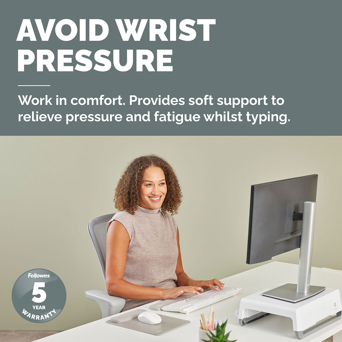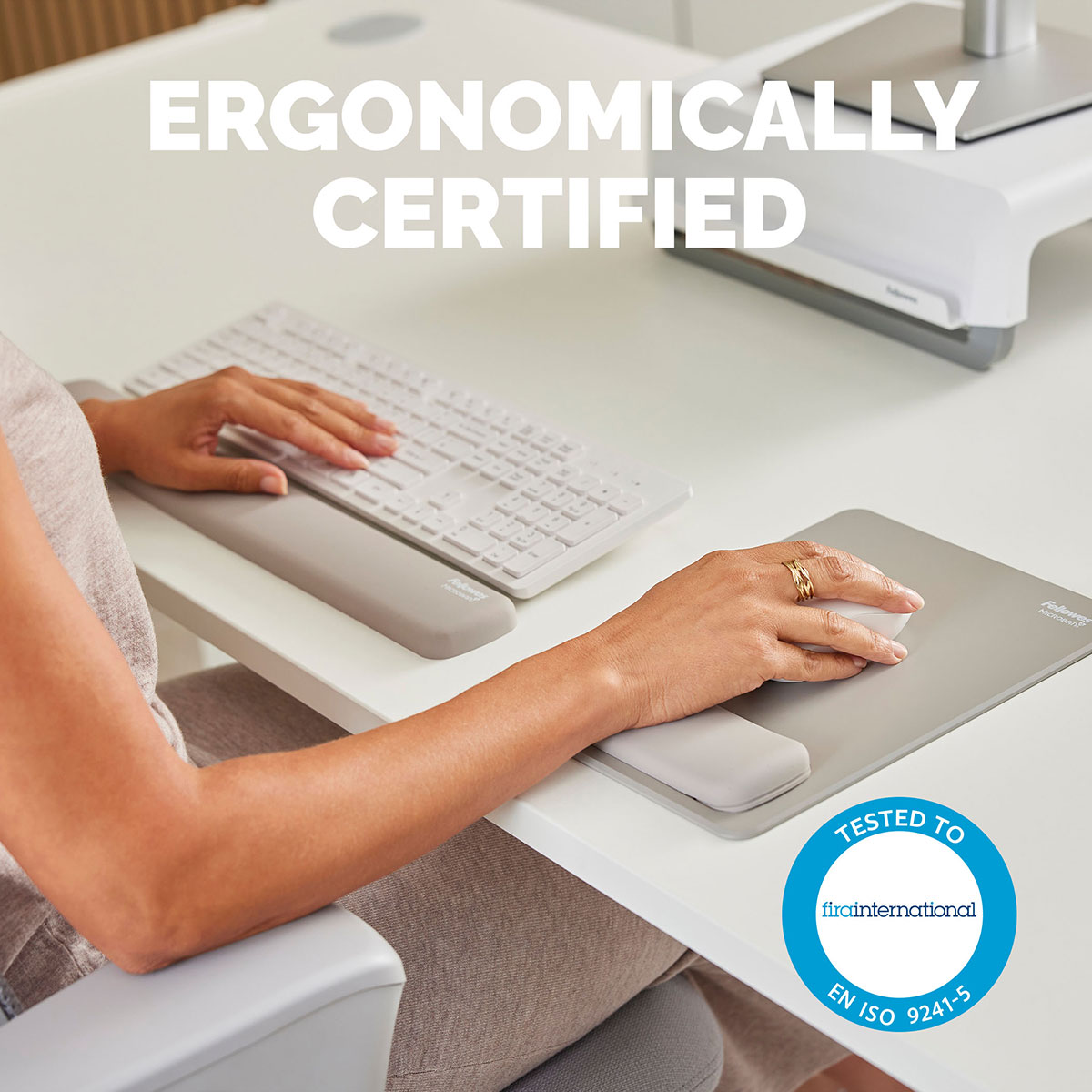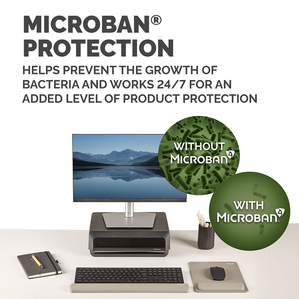 Include protectie Microban incorporata, care ajuta la prevenirea dezvoltarii bacteriilor si actioneaza permanent (24/7) pentru un plus de protectie a produsului. Este 100% reciclabil prin programul de recuperare Fellowes si este construit pentru durabilitate, fiind testat de FIRA International Ltd pentru conformitate ergonomica conform EN ISO 9241-5.