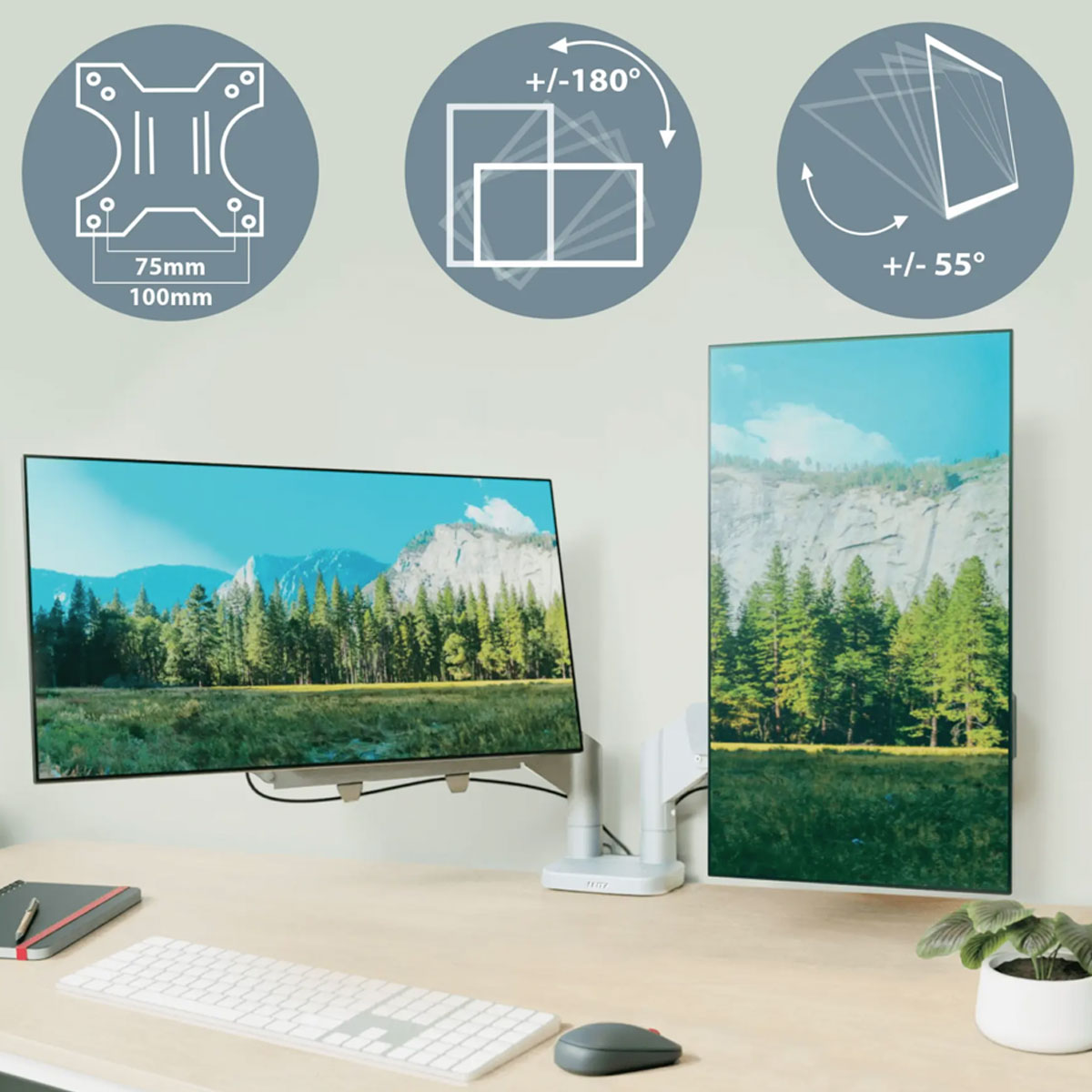 Ajustare usoara a inaltimii, adancimii si unghiului cu o singura mana: rotire stanga/dreapta +90°/-90°, rotire orizontala si verticala a monitorului pana la 180°, inclinare ecran +55°/-55°.
