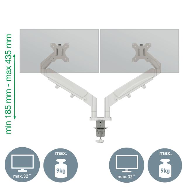 Proiectat pentru stabilitate! Design puternic și stabil pentru a susține două monitoare plate sau curbate de 17”-32” fiecare cântărind până la 9 kg (19,8 lbs) fiecare