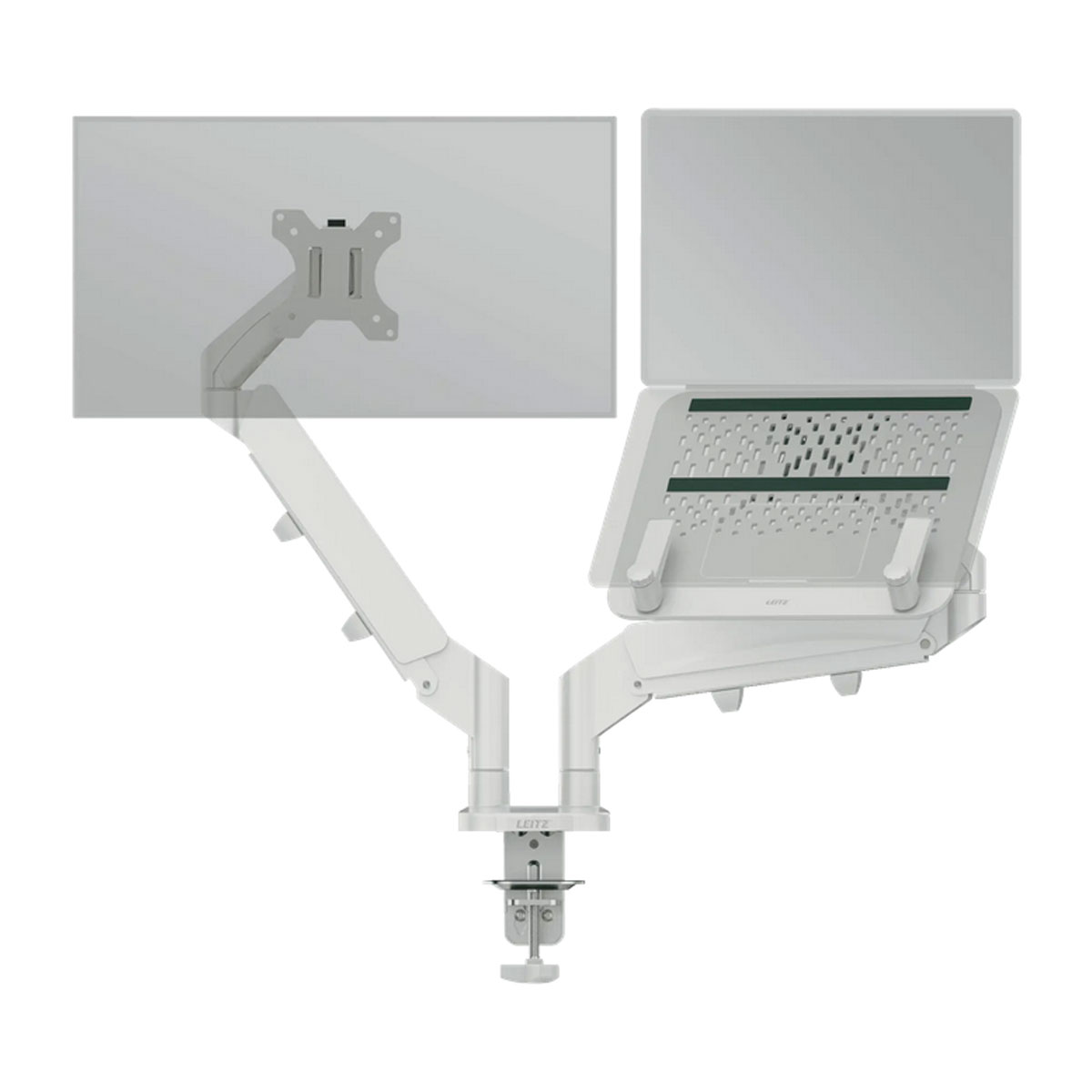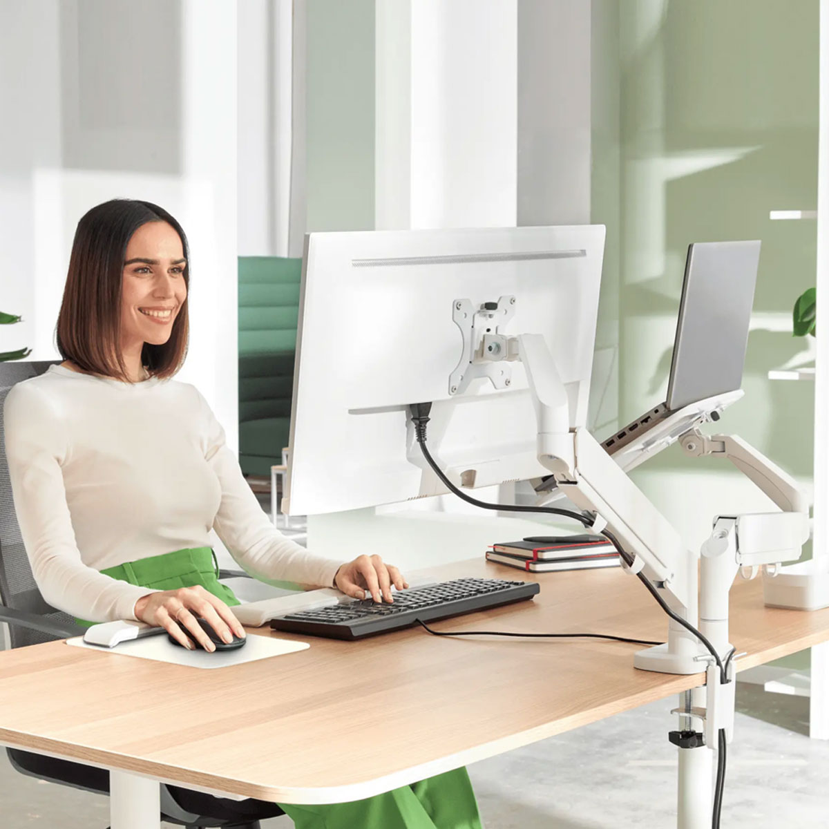 Suport pentru monitor dublu, cu suport special pentru laptop, care pot imbunatati postura, alinierea ochilor si confortul gatului si umerilor atunci cand inaltimea monitorului si a laptopului sunt reglate corect.