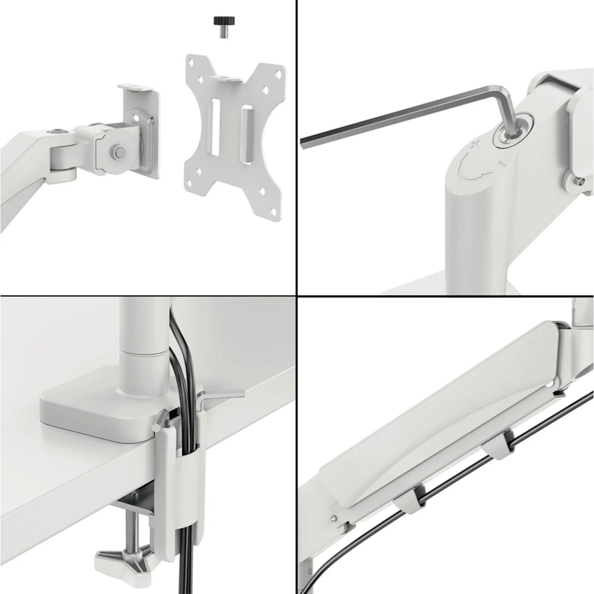 Usor de instalat, cu placa VESA detasabila cu eliberare rapida inclusa (75 si 100 mm) si clema in C din cauciuc siliconic, care reduce vibratiile si protejeaza suprafata biroului; sau montaj prin orificiul pentru manson (interval grosime birou: 10–80 mm). Instrumente pentru asamblare si reglaje incluse.